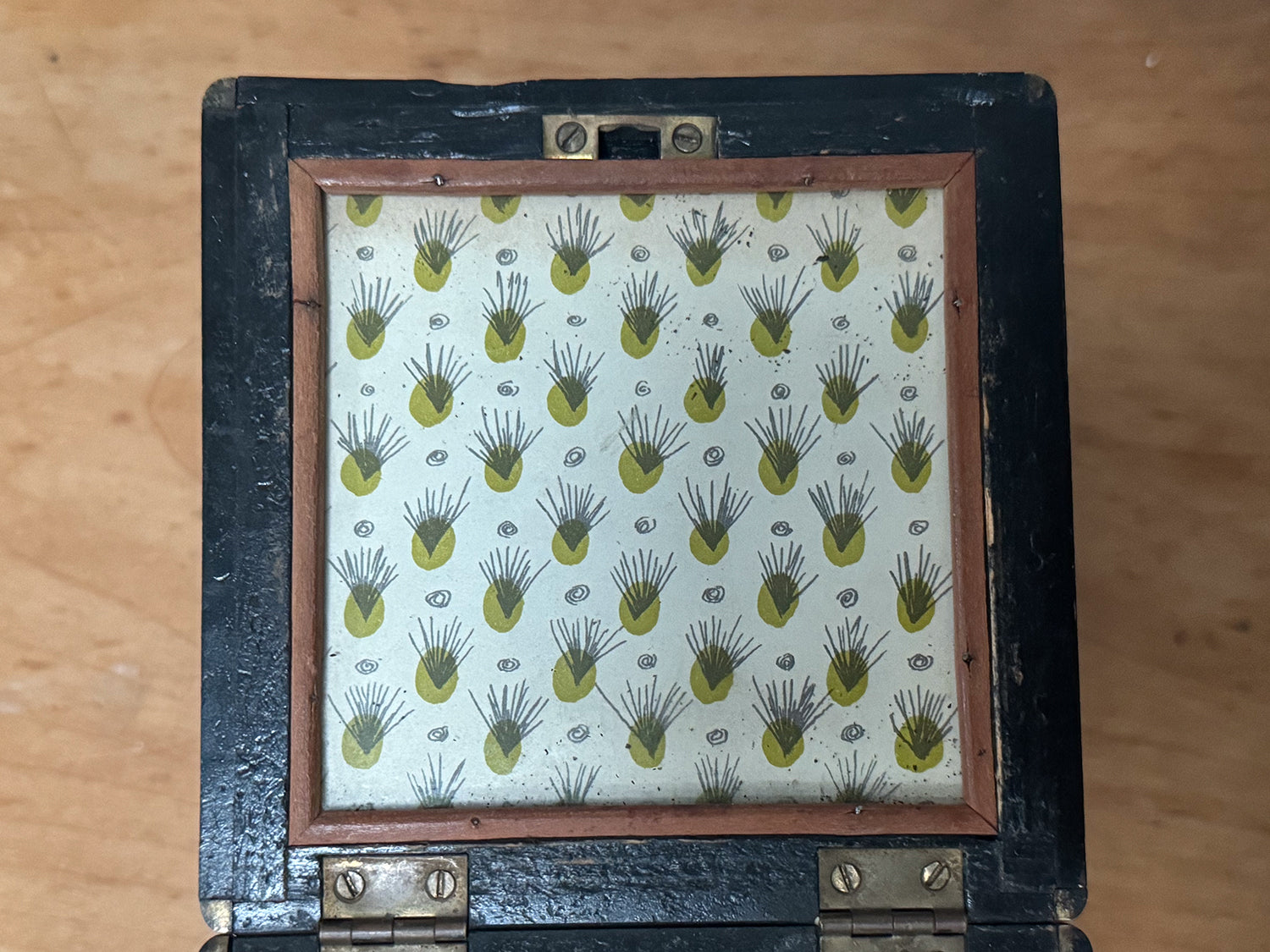 Having a push button clasp, the lid opens to reveal the interior which is lined with a hand printed paper which is protected by glazed covers.