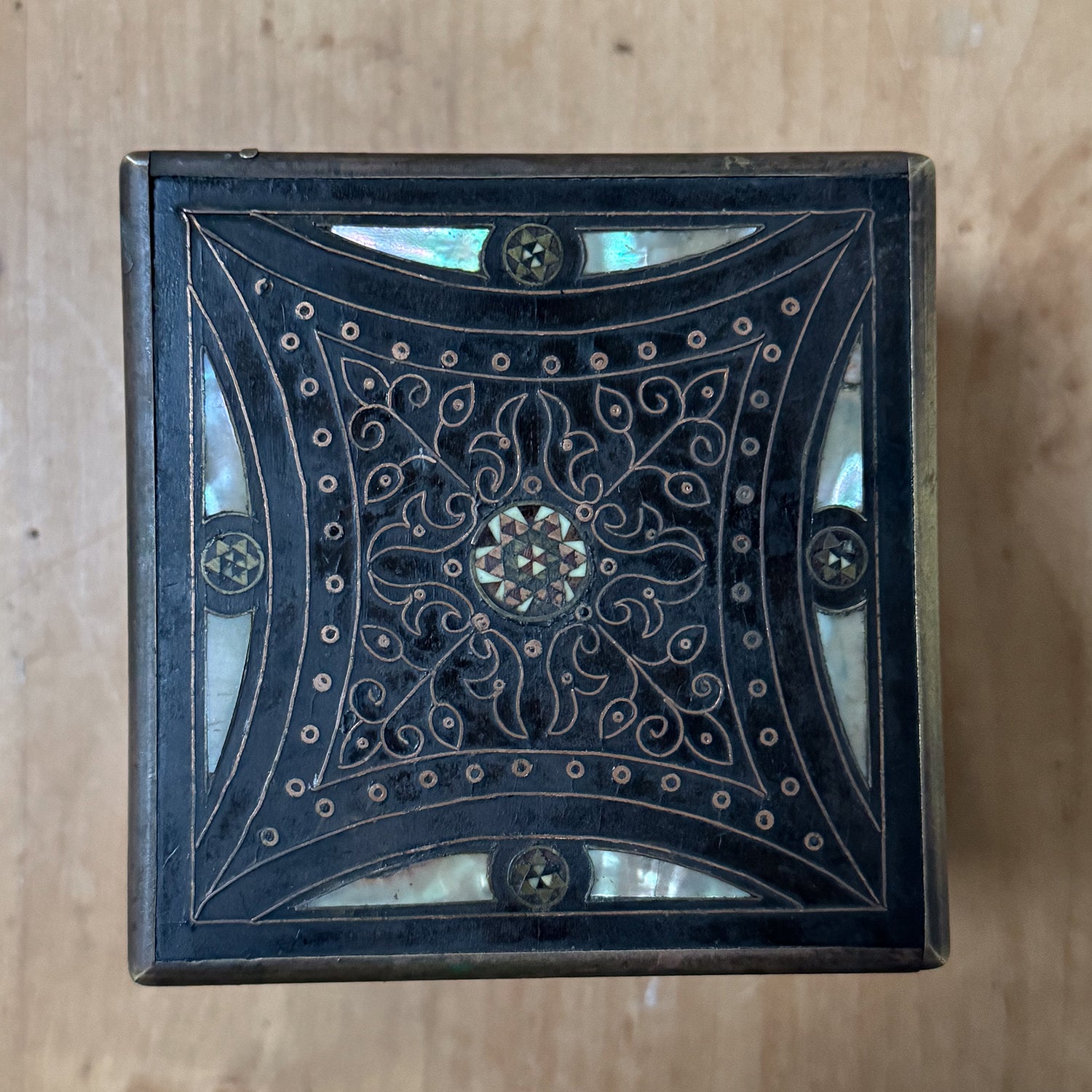 The ebony lidded box is inlaid with brass and mother of pearl.