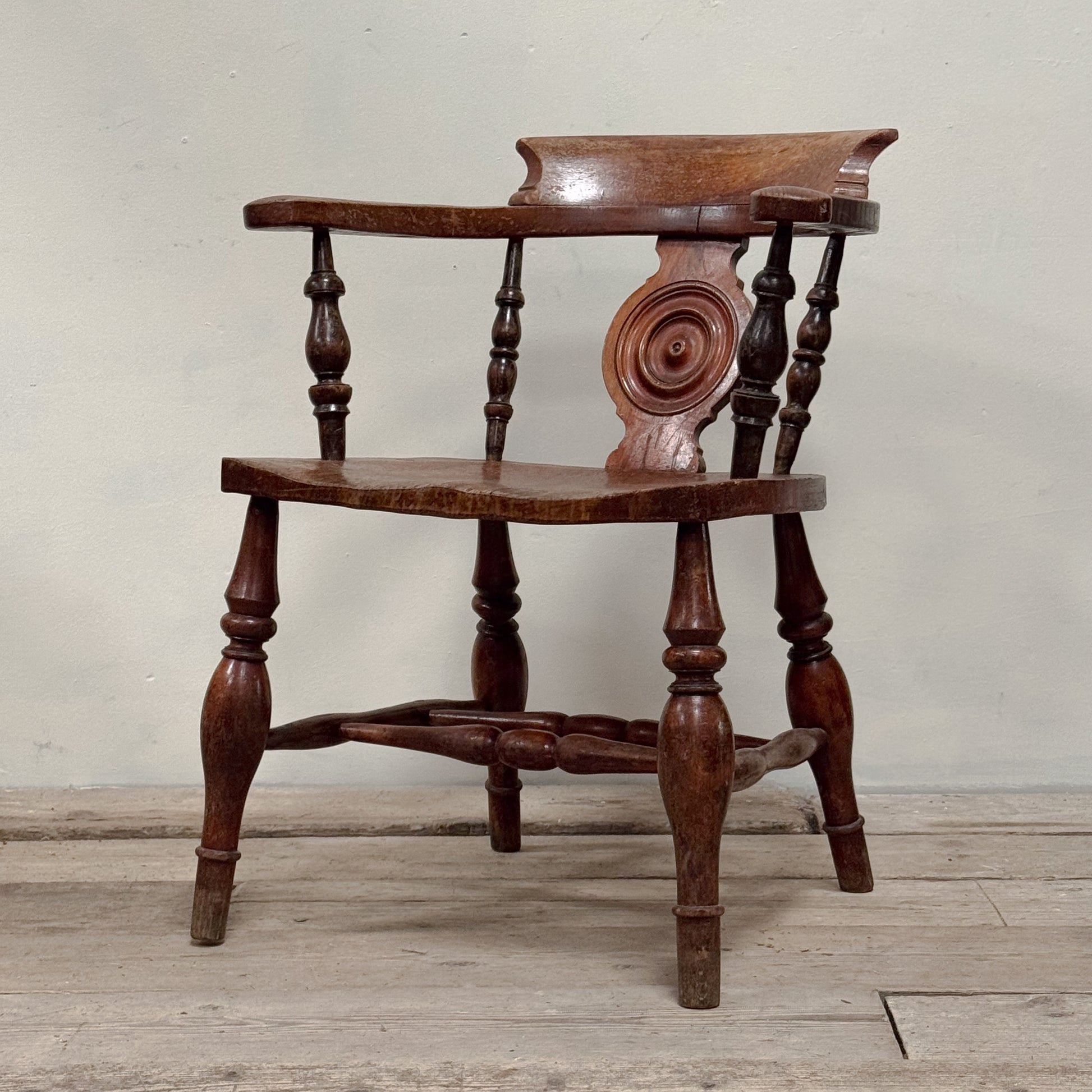 Having a roundel, central back splat and turned spindles flanking.