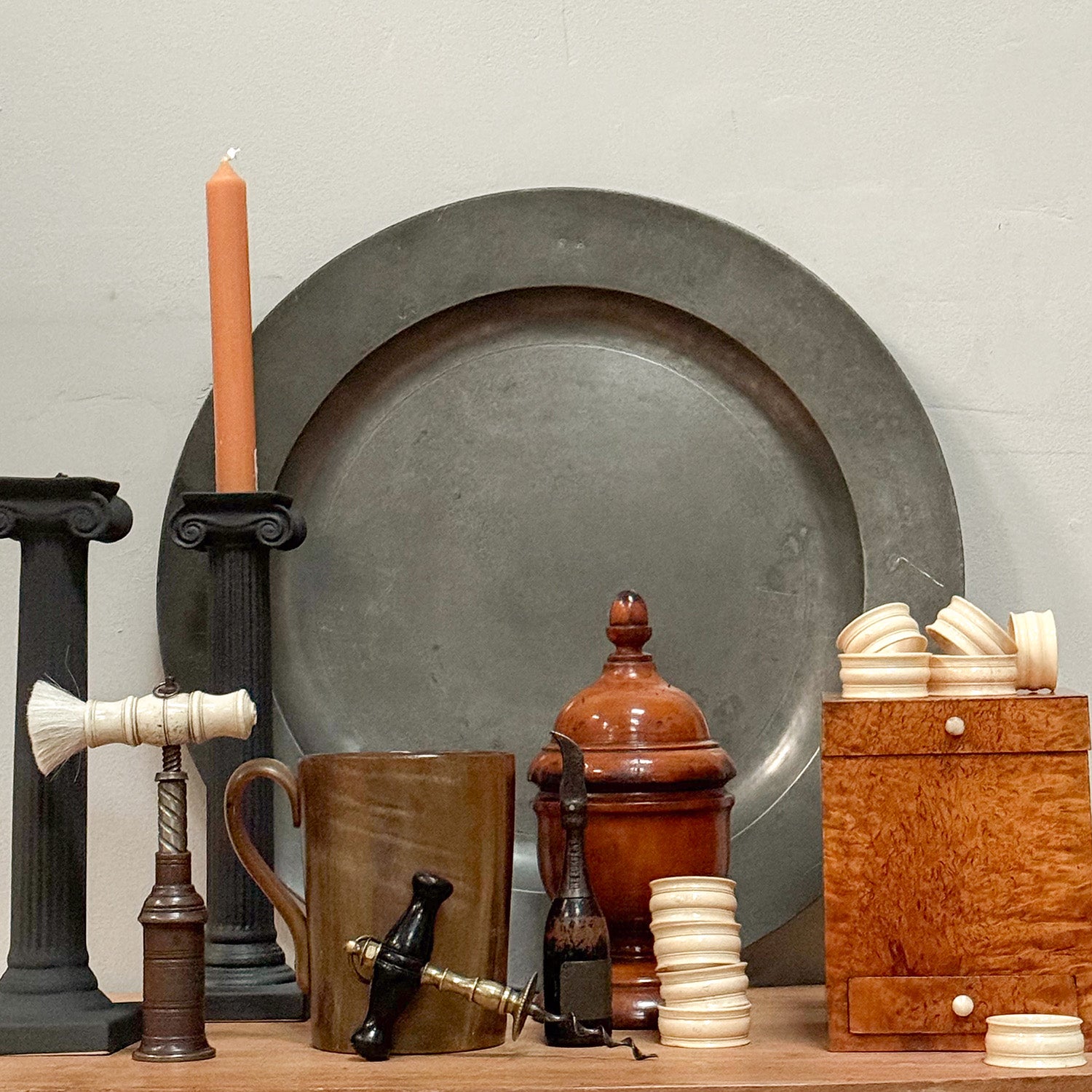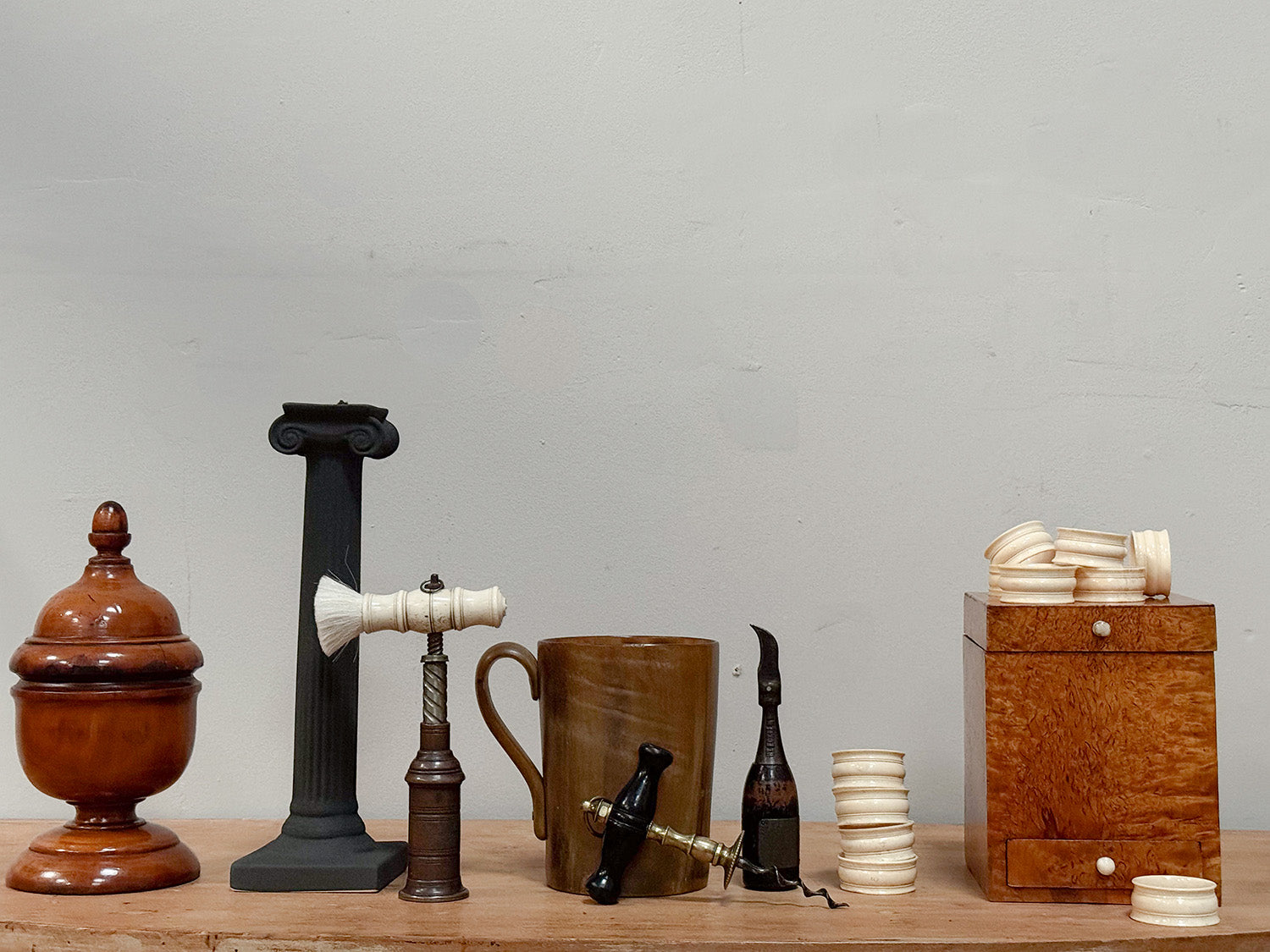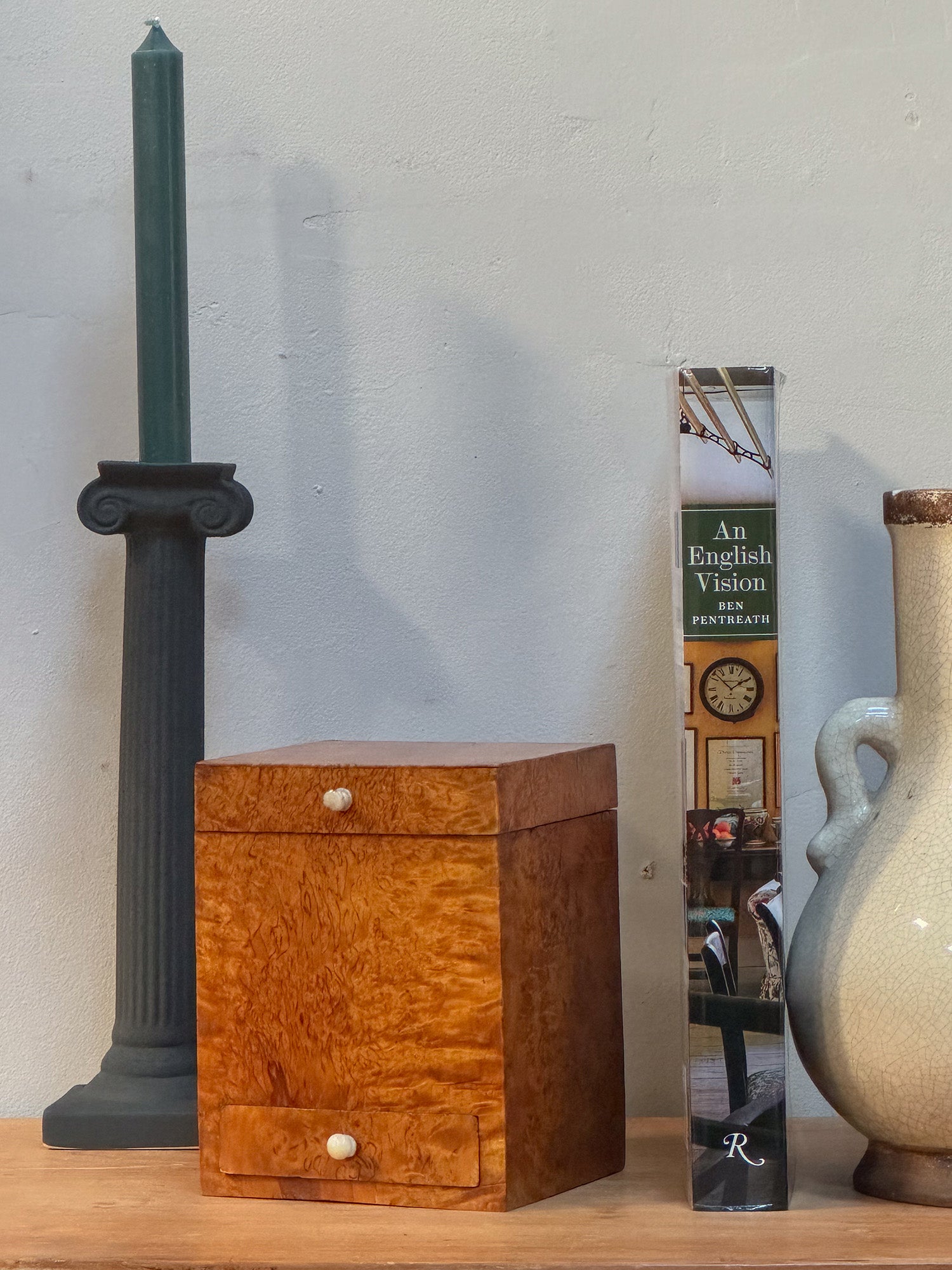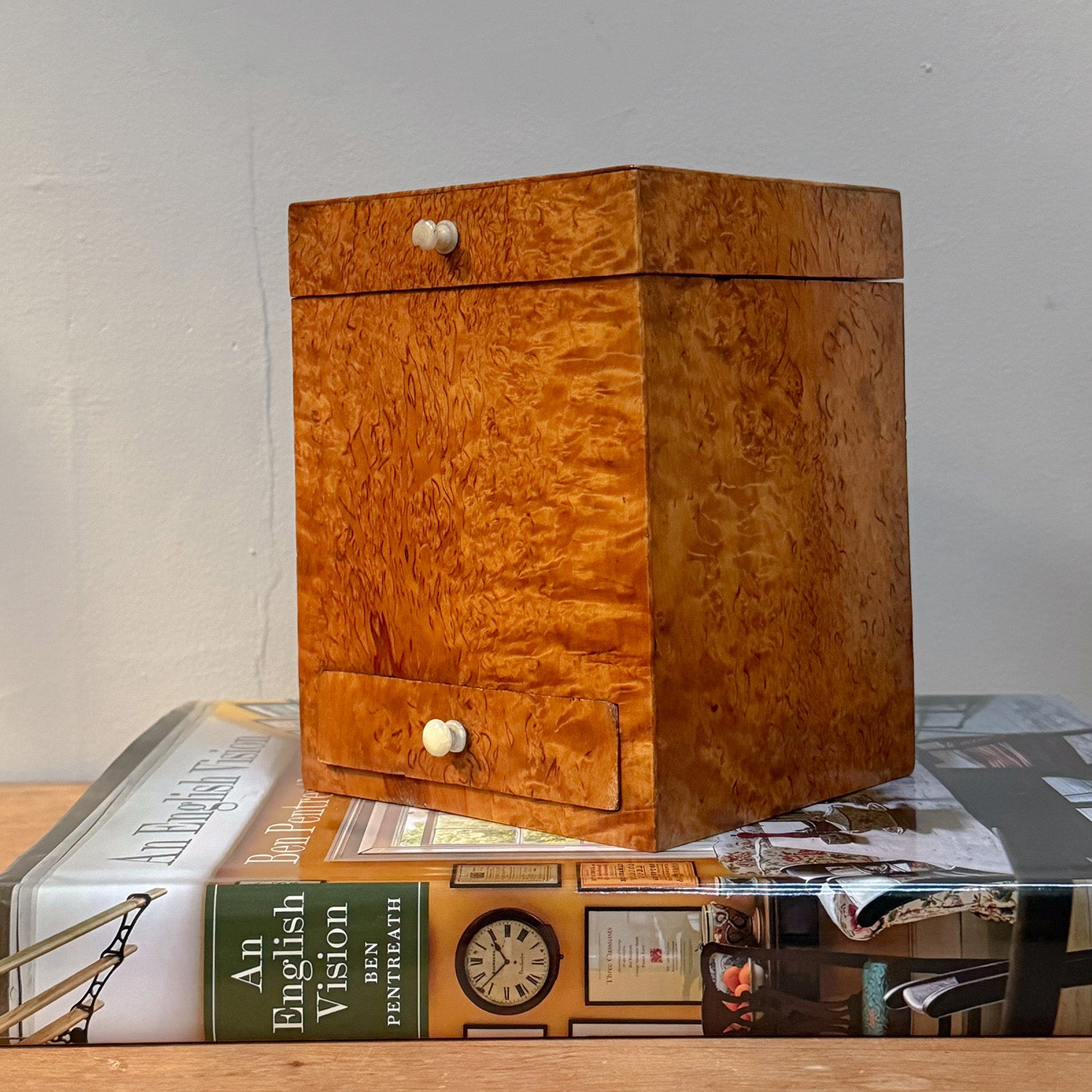 The lidded pine box is veneered in burr birch of a superb, vibrant colour. The bottom drawer and the lid both retain the original bone handles.