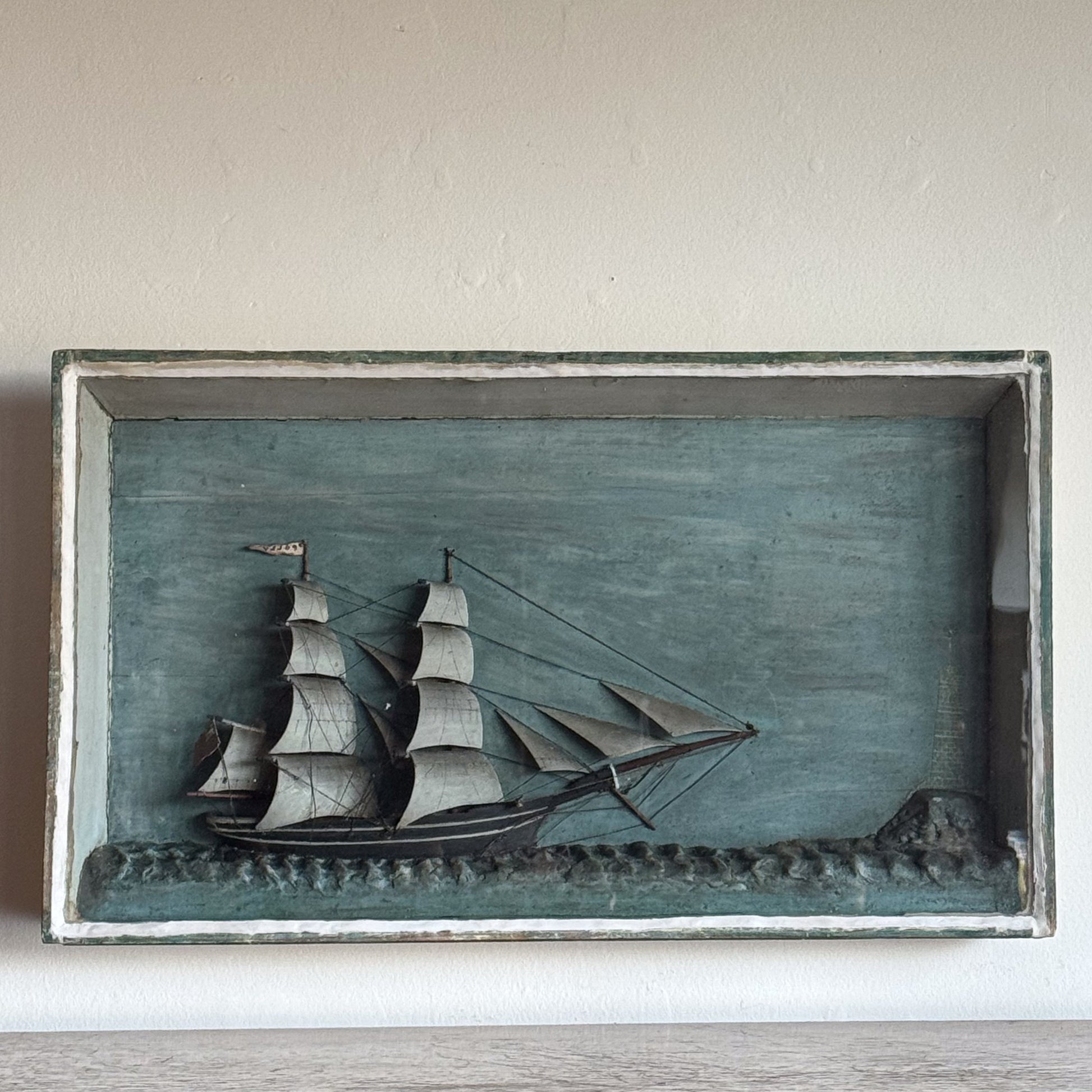 A folk art sailor-made diorama of a three masted ship. Presented within its original shadowbox frame.