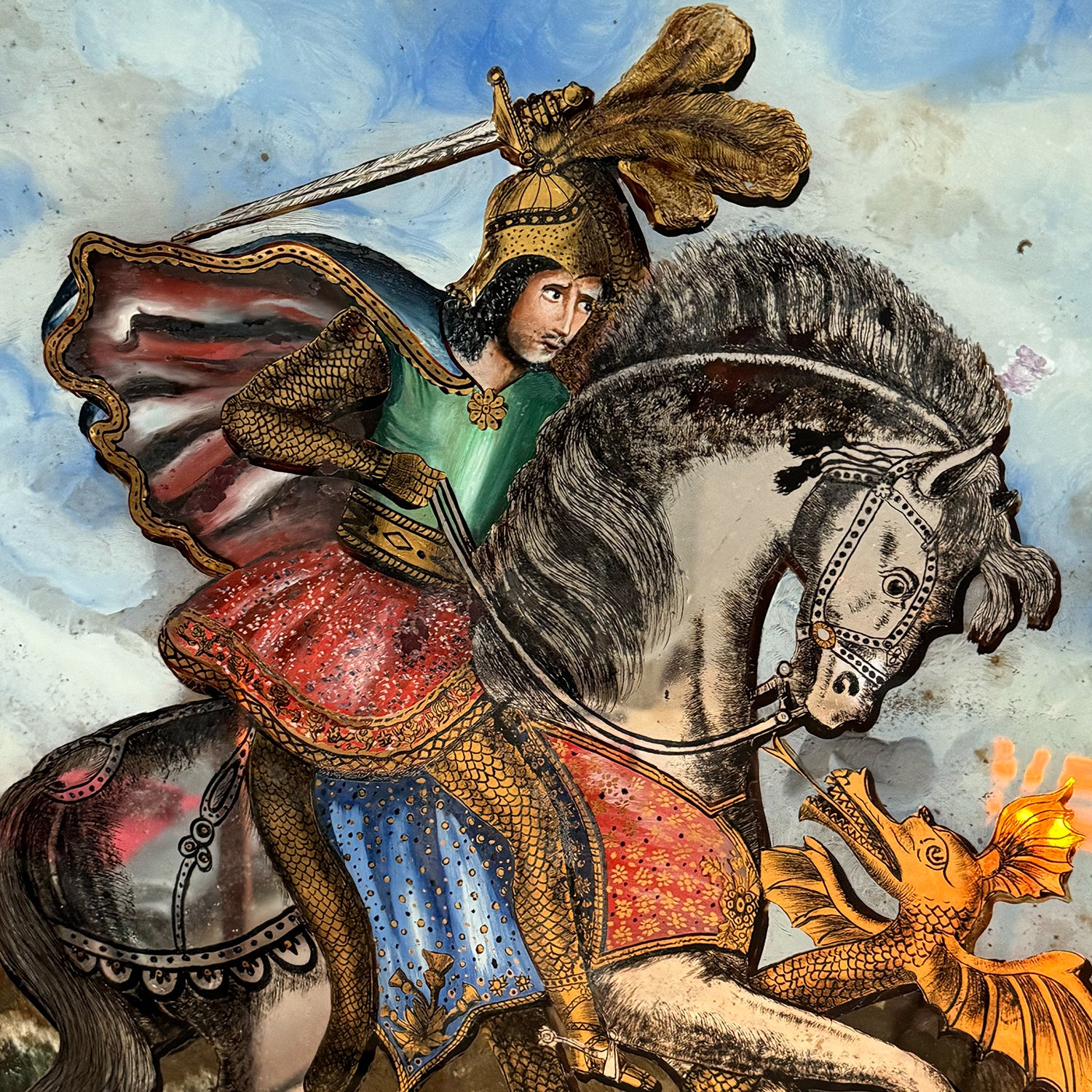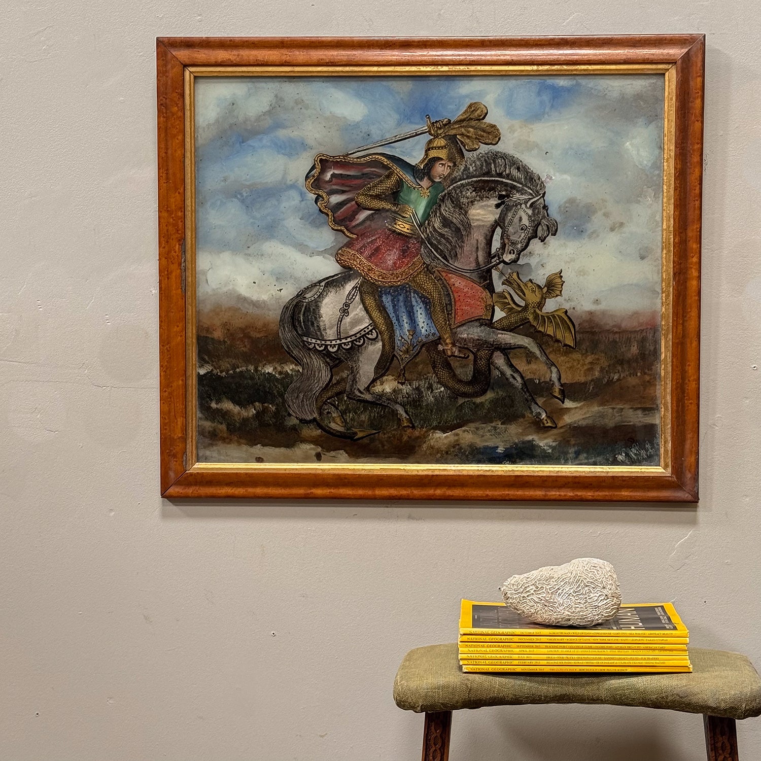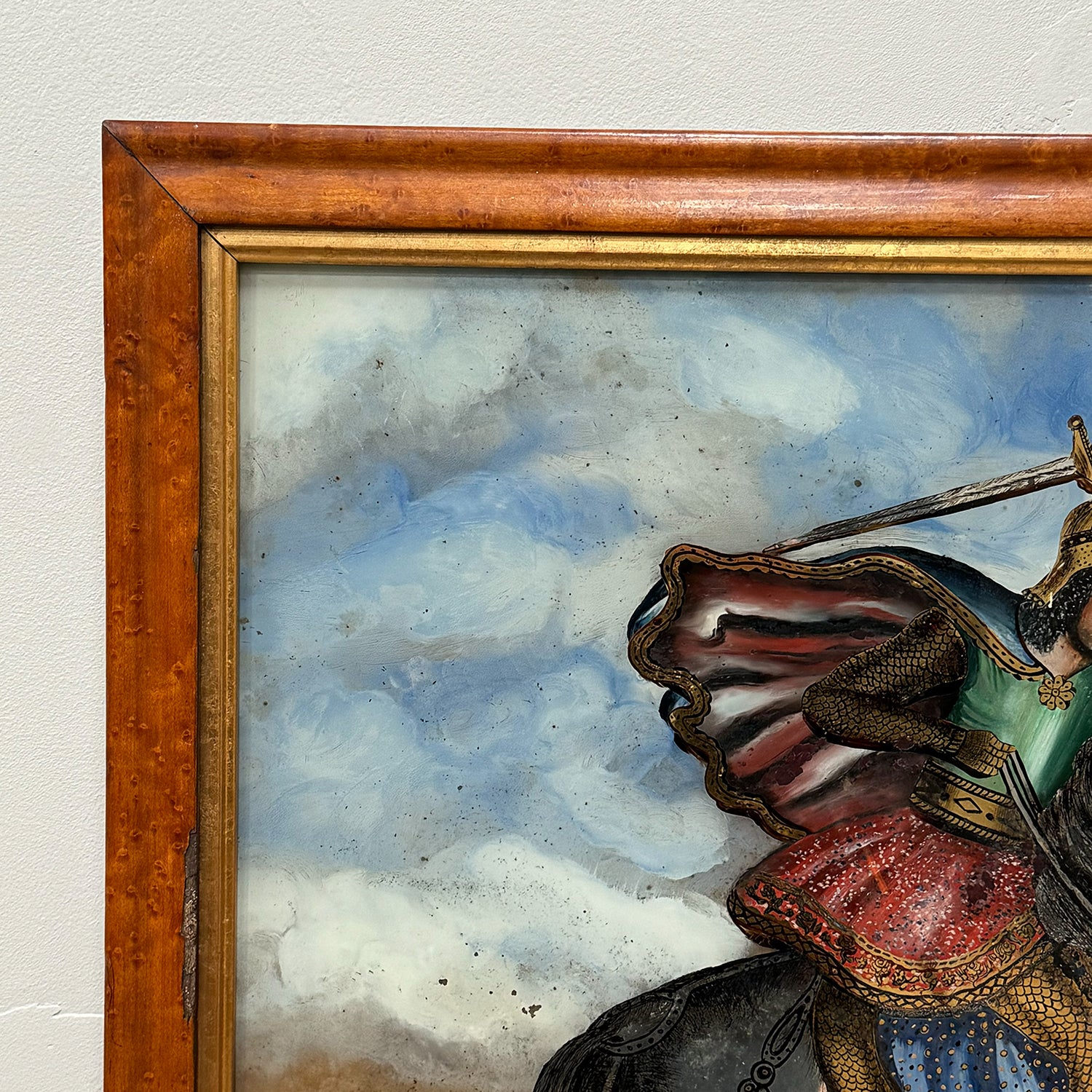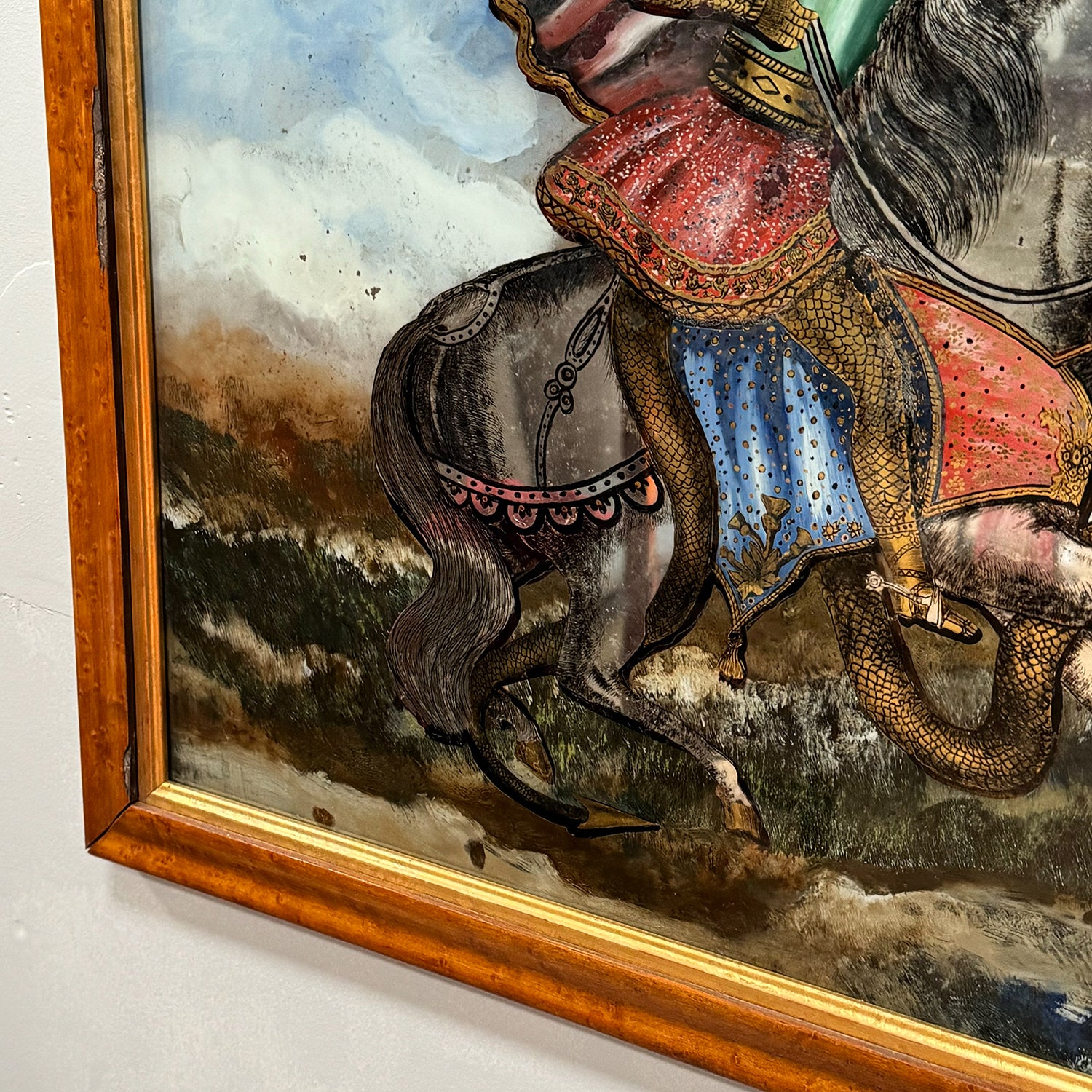 St. George and the Dragon depicted. In original birds eye maple frame with gilt slip.
