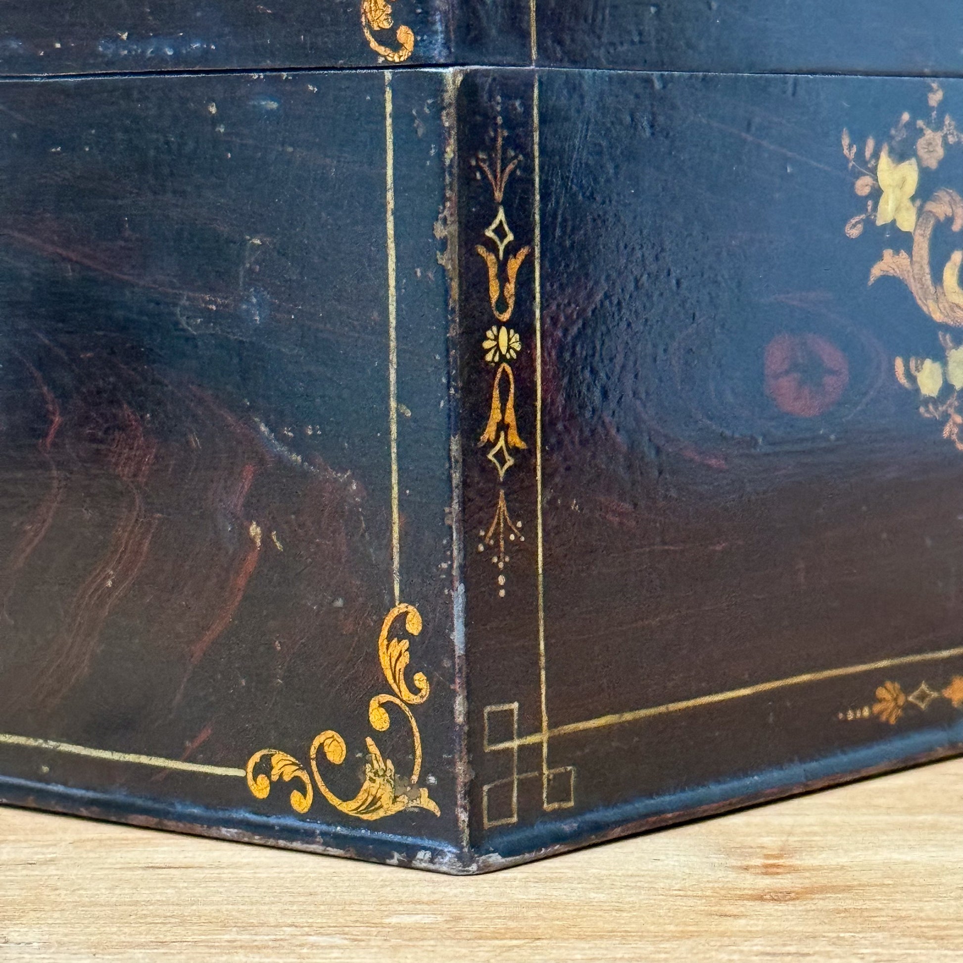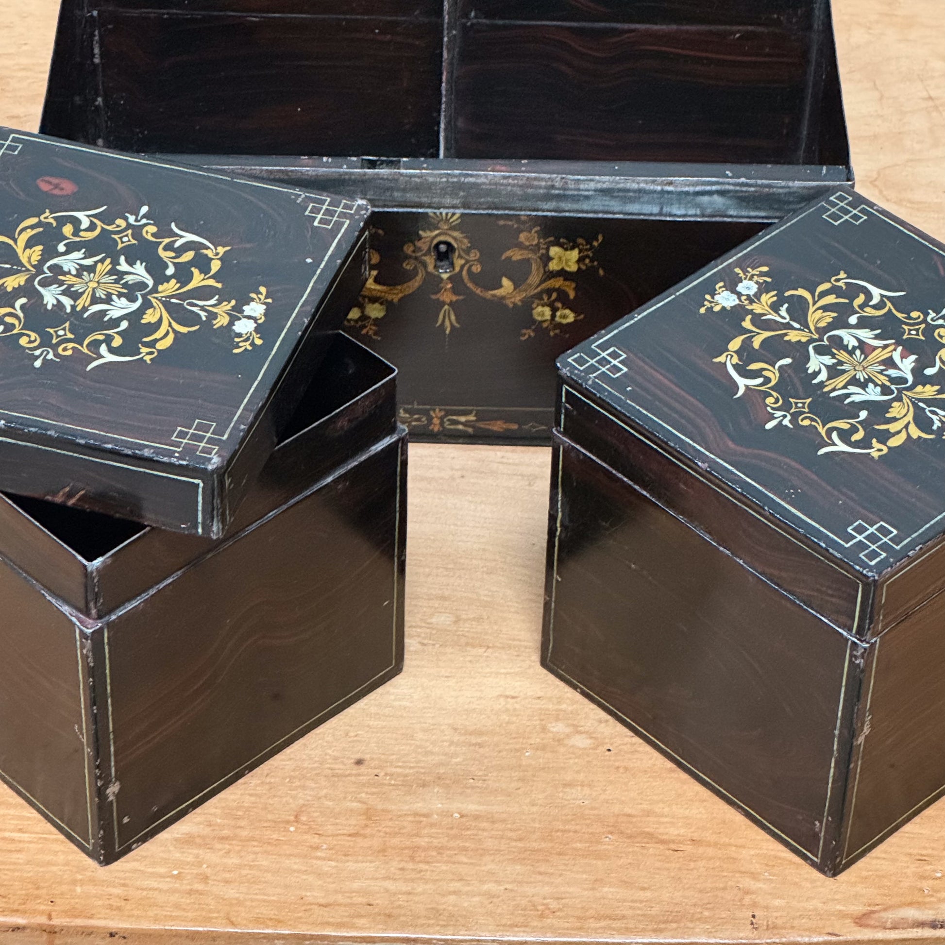 The original tins are retained inside with the same simulated rosewood and foliage decoration.