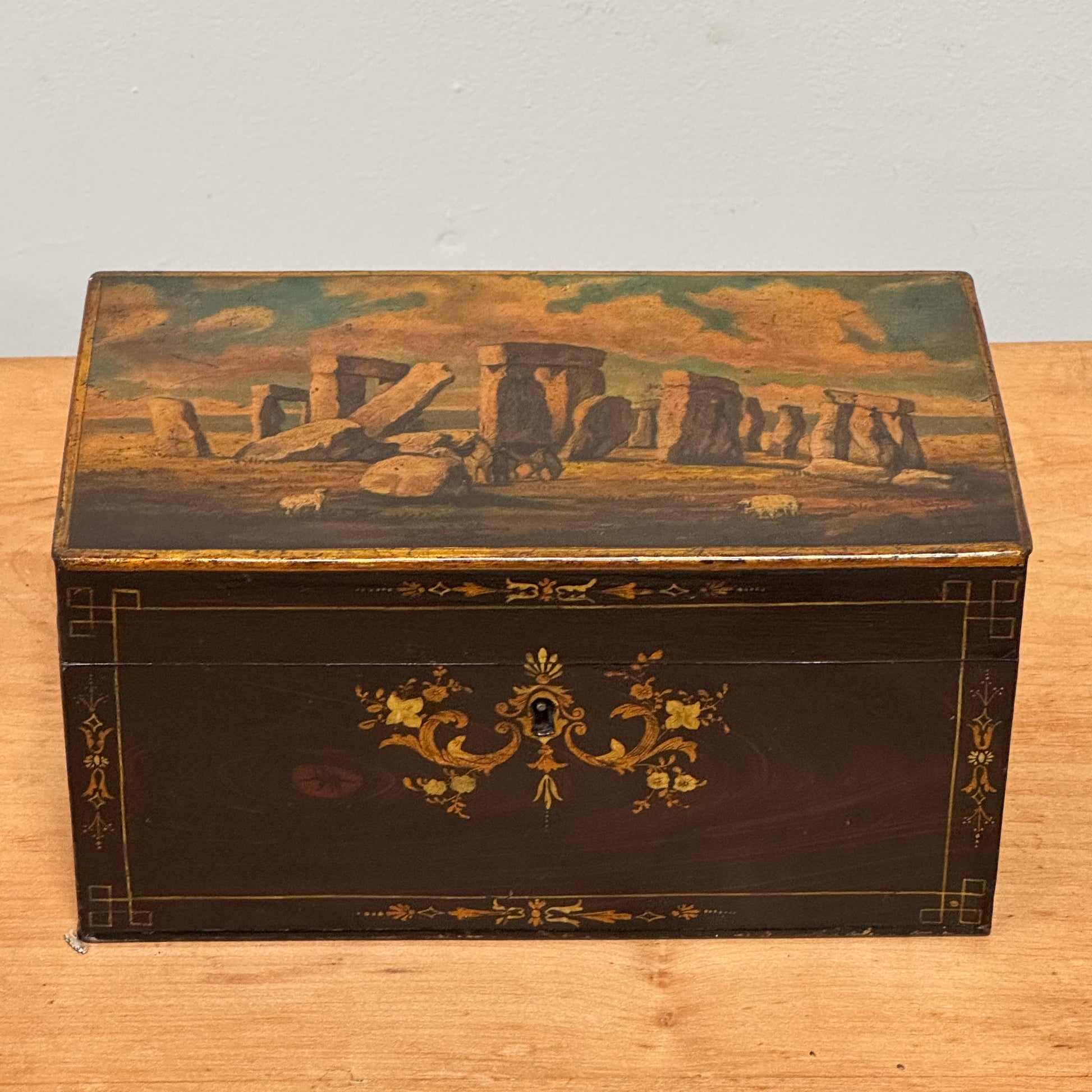 The lid with a finely painted scene of Stonehenge.