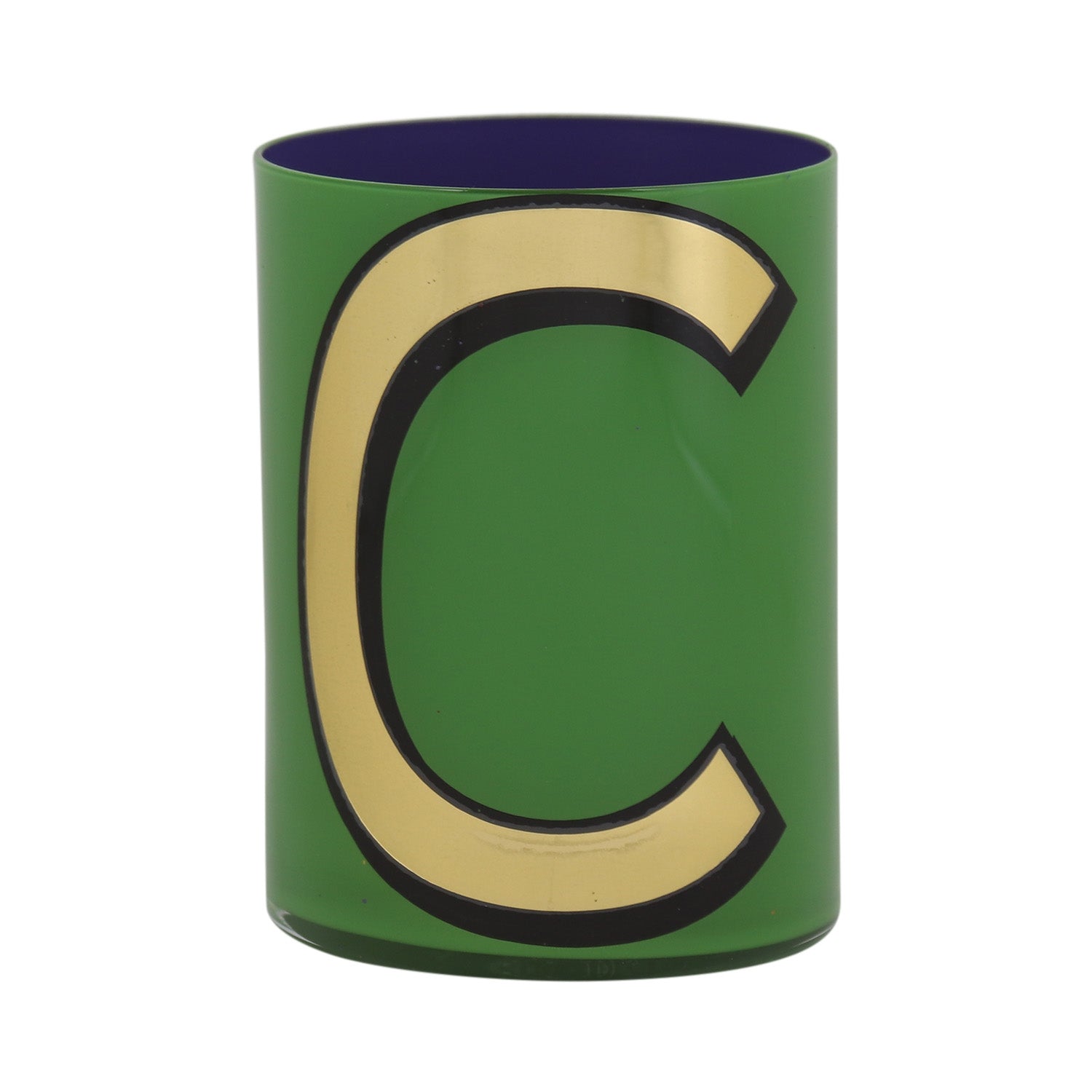 Smooth glass tumblers inlaid with a gold vinyl letter or symbol, backed with a different coloured lacquer and a topcoat of glossy varnish. They are for decorative use only and are not suitable for food consumption. Whilst durable, the lacquers are water-soluble so if they were ever to be used to hold a posy of flowers (which is a fabulous idea) the best thing is to put a small jar of water inside.
