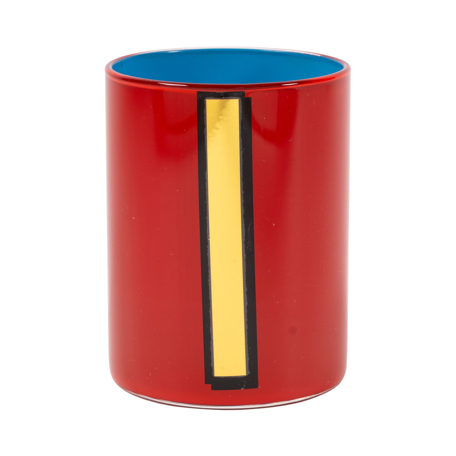 Smooth glass tumblers inlaid with a gold vinyl letter or symbol, backed with a different coloured lacquer and a topcoat of glossy varnish. They are for decorative use only and are not suitable for food consumption. Whilst durable, the lacquers are water-soluble so if they were ever to be used to hold a posy of flowers (which is a fabulous idea) the best thing is to put a small jar of water inside.