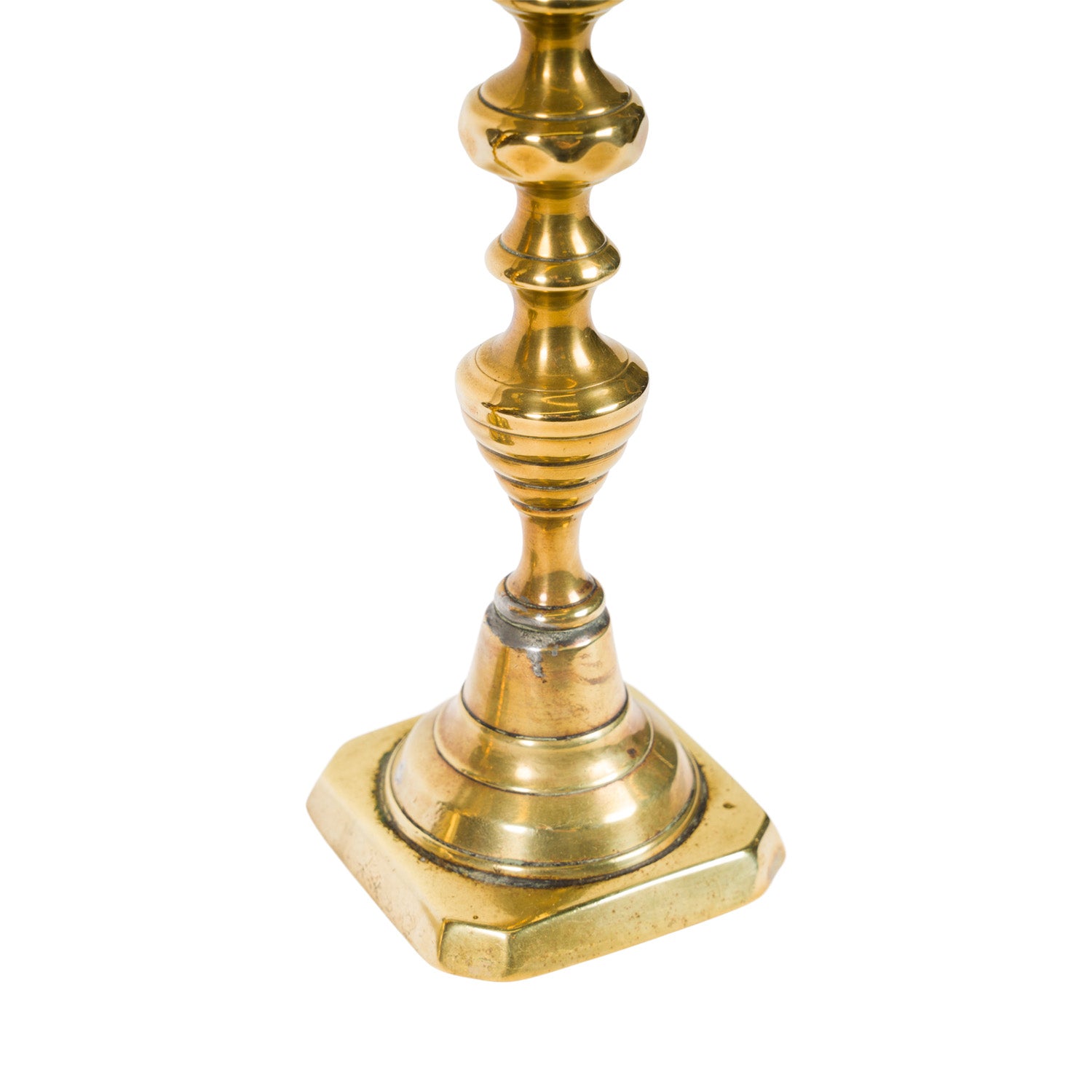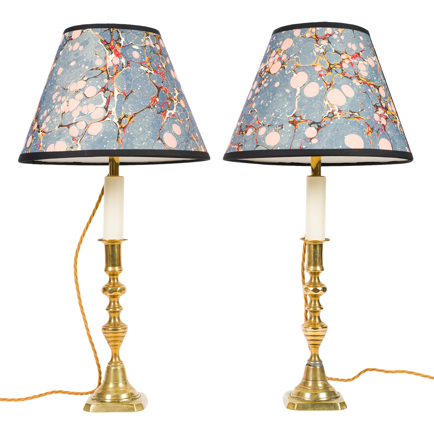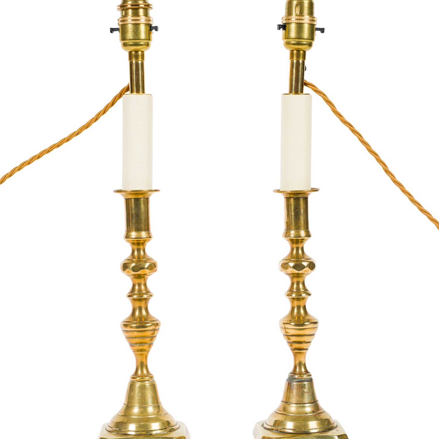 A pair of English 19th Century antique brass candlesticks which have been converted into lamps, with white card 'candlesleeves' and brown silk flex.