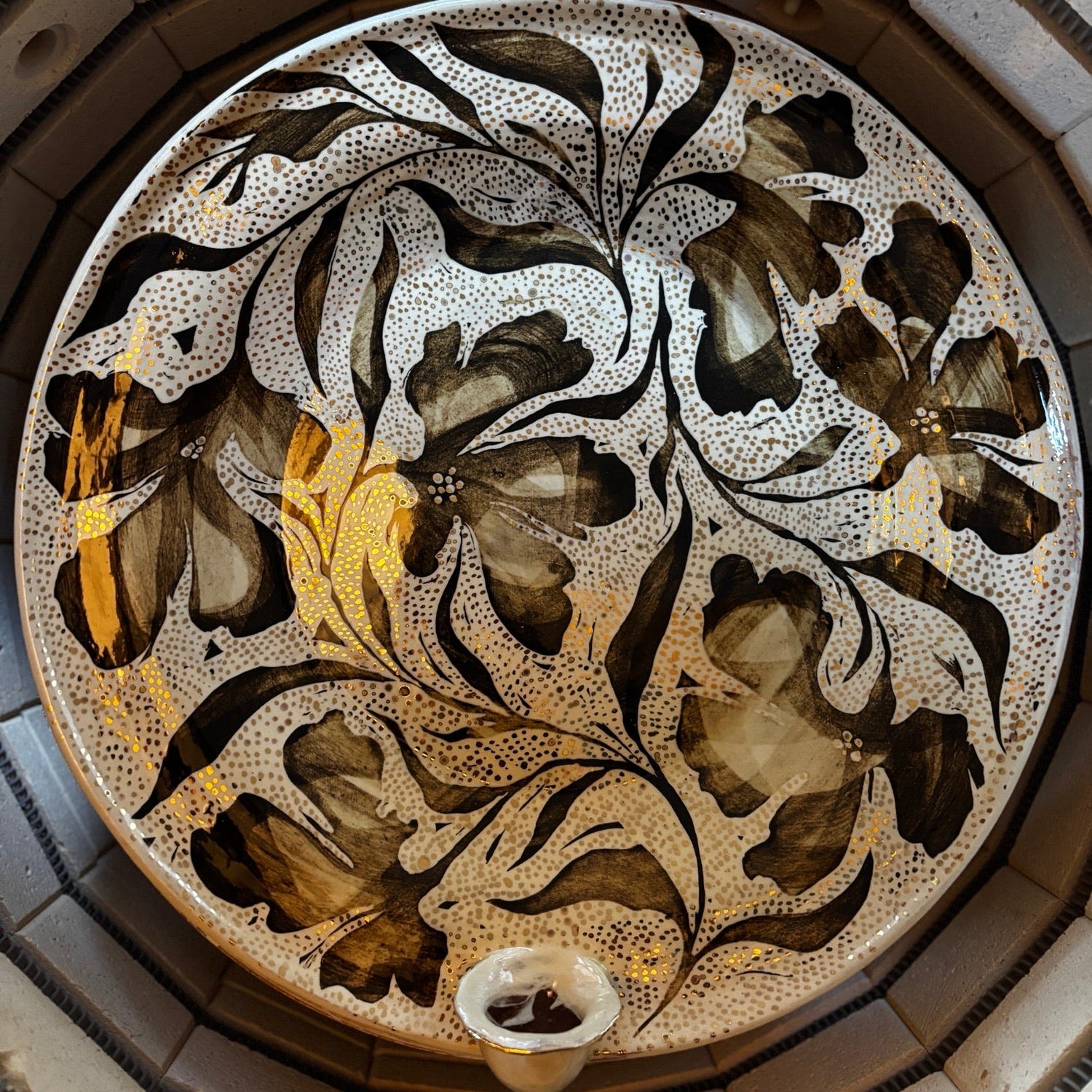 Terracotta intricately decorated in 9ct gold lustreware and slip.