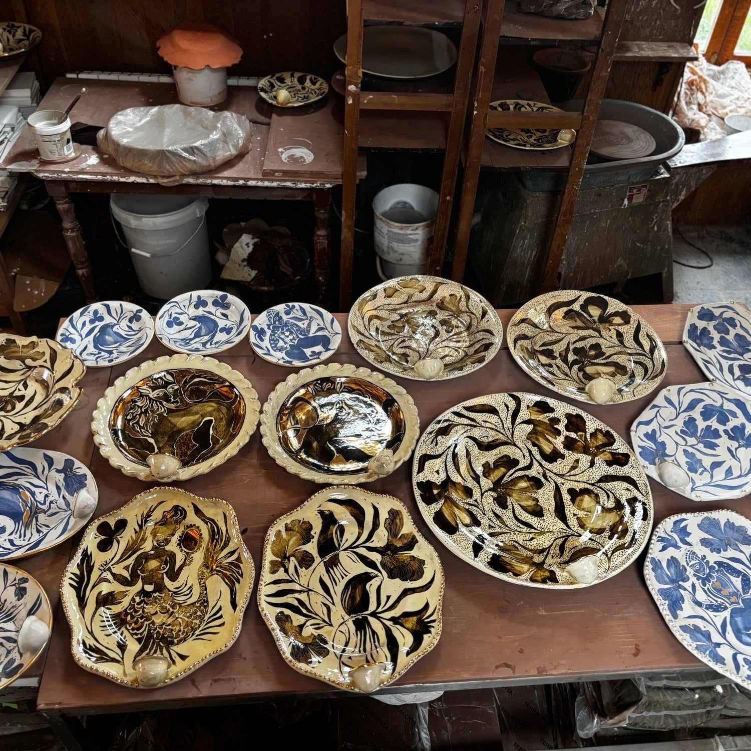 Drawing inspiration from the landscape, folklore, motherhood, myth and magic. Artist Freyja Lee uses pots as her canvas. Made of terracotta and depicting imagery rich in symbolism and tradition. Reminiscent of the revived lustrewares in art pottery of William de Morgan.