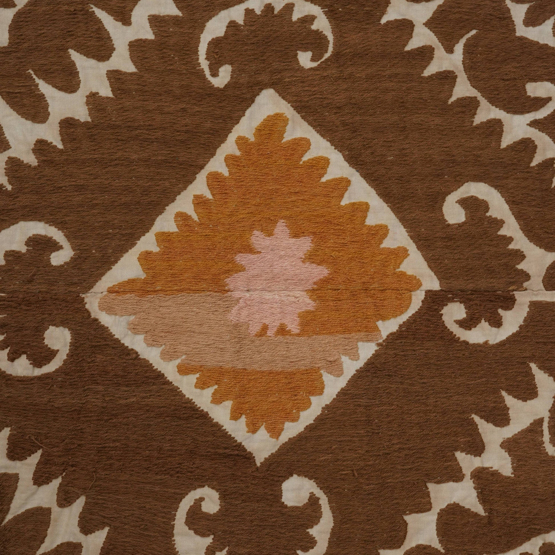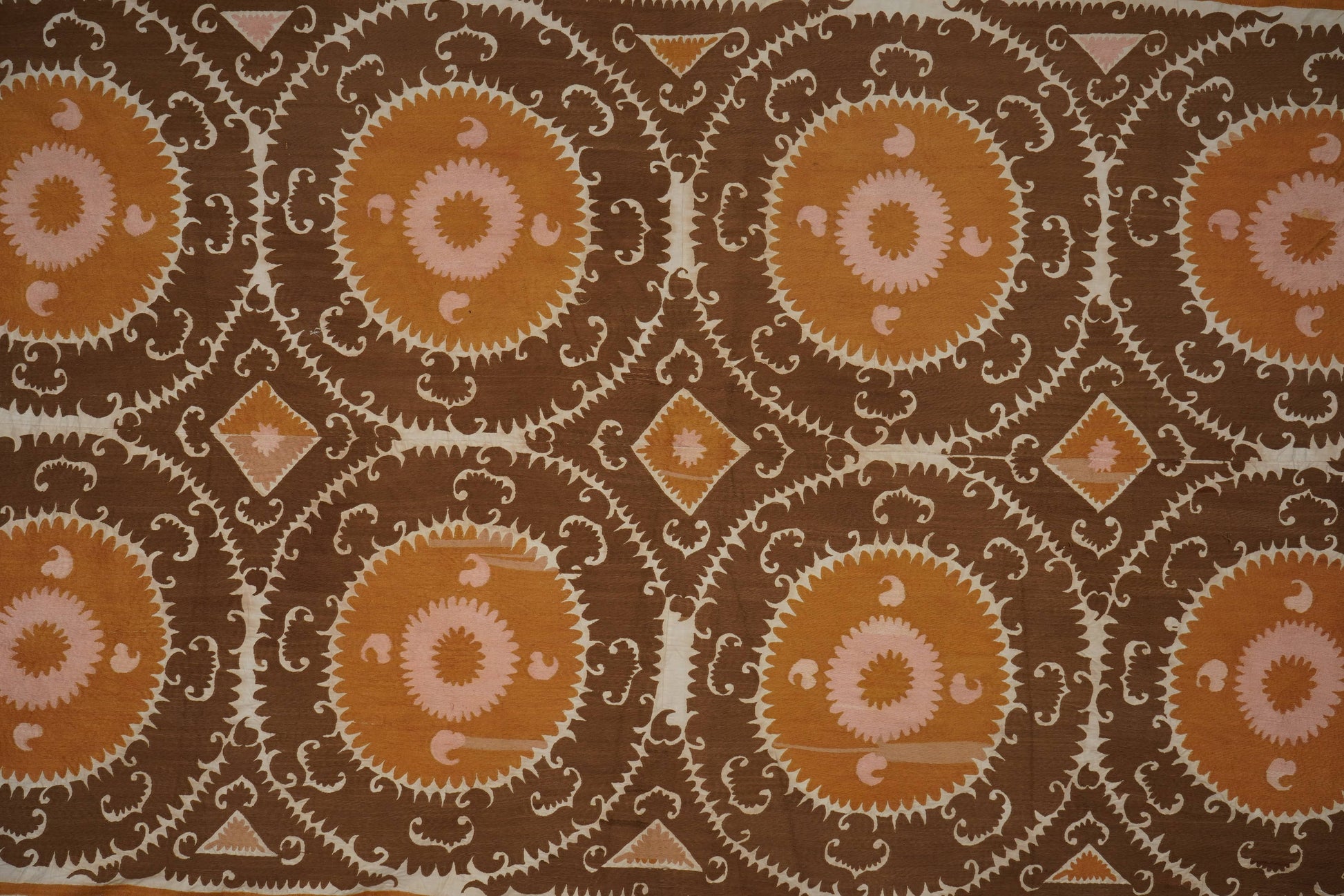 There are variations in the shade of the thread used to embroider this, as is commonly seen in older suzanis that were made for personal use in people’s homes. Embroidery on a cotton base. While this suzani is in wonderful condition, there are small stains and signs of wear on this suzani, that are to be expected with vintage pieces.