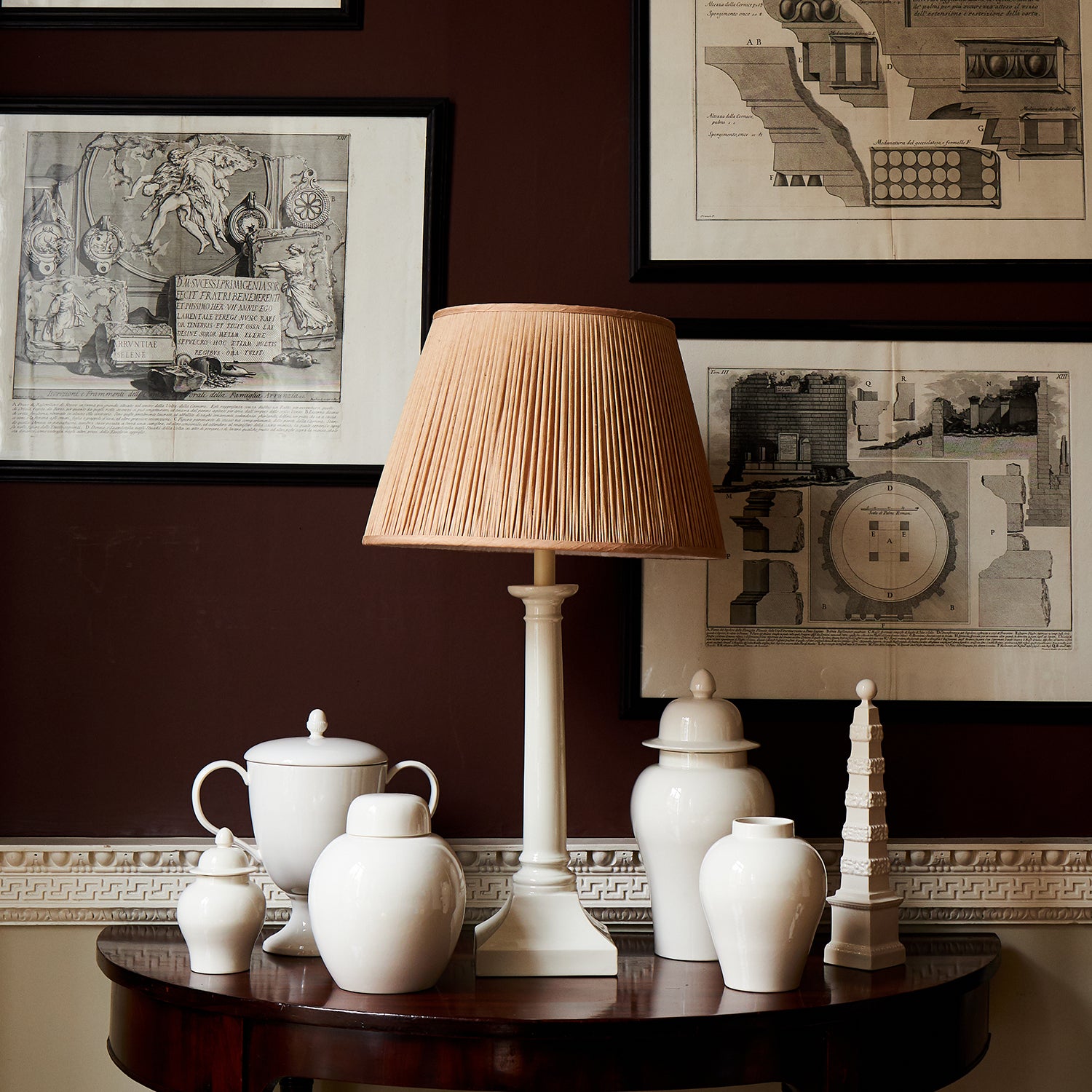 For a long time Ben produced a painted wooden version, for use in his decoration projects and for sale in the shop, but it never felt as good as the ceramic original, and 18 months ago we revived the conversations with our pottery about whether they could tackle such a monumental piece. We’ve been through countless rounds of, drawing, sampling and production before they managed it, but at last – we are thrilled to announce our new Great Creamware Column Lamp, also available as the Great Creamware Candlestick. Used singly or as a pair, they make the most wonderful statement in your room – yet are imbued with the same subtle, authentic restraint as the original.