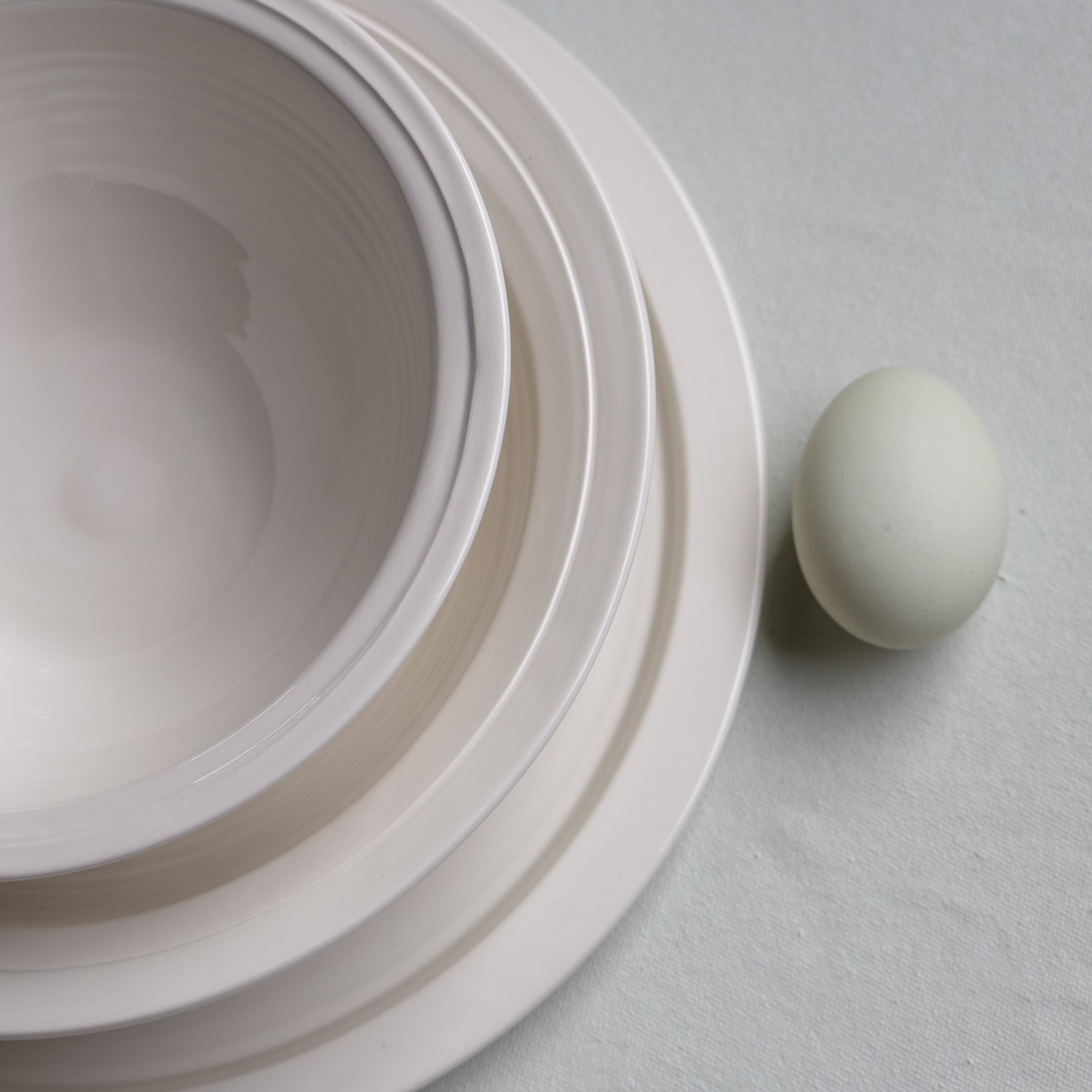 The white creamware dishes are light and simple but sturdy, with a transparent finish. The mould for each shape was hand thrown by Frances to coordinate with her full collection. The dishes are designed for everyday use, and each piece is dishwasher- and microwave-safe. The creamware is of superlative quality and durability.