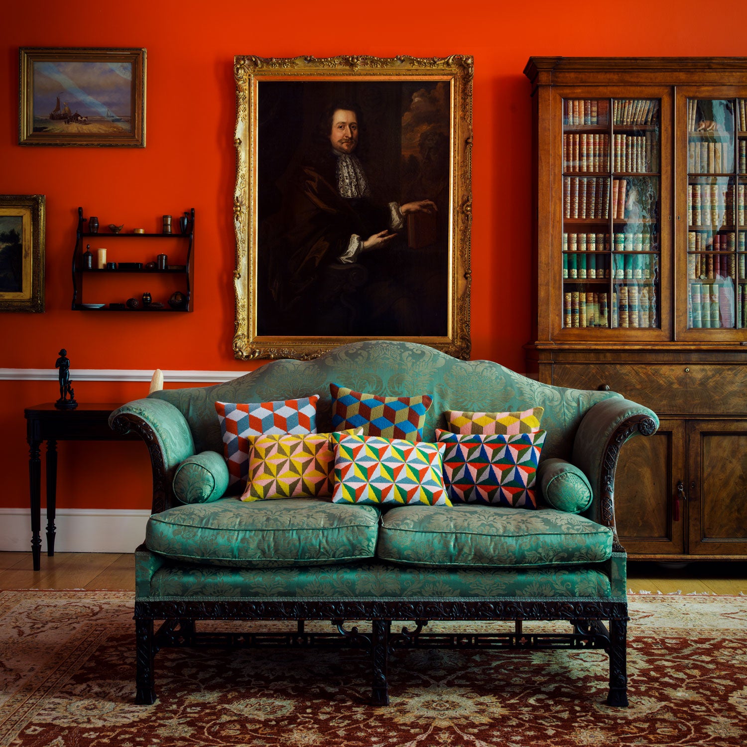 'Falling Cubes' - taken from a floor pattern from Batty Langley's 18th century 'Treasury of Design' and reimagined in inspired colours for this needlepoint cushion project which began in 2010.