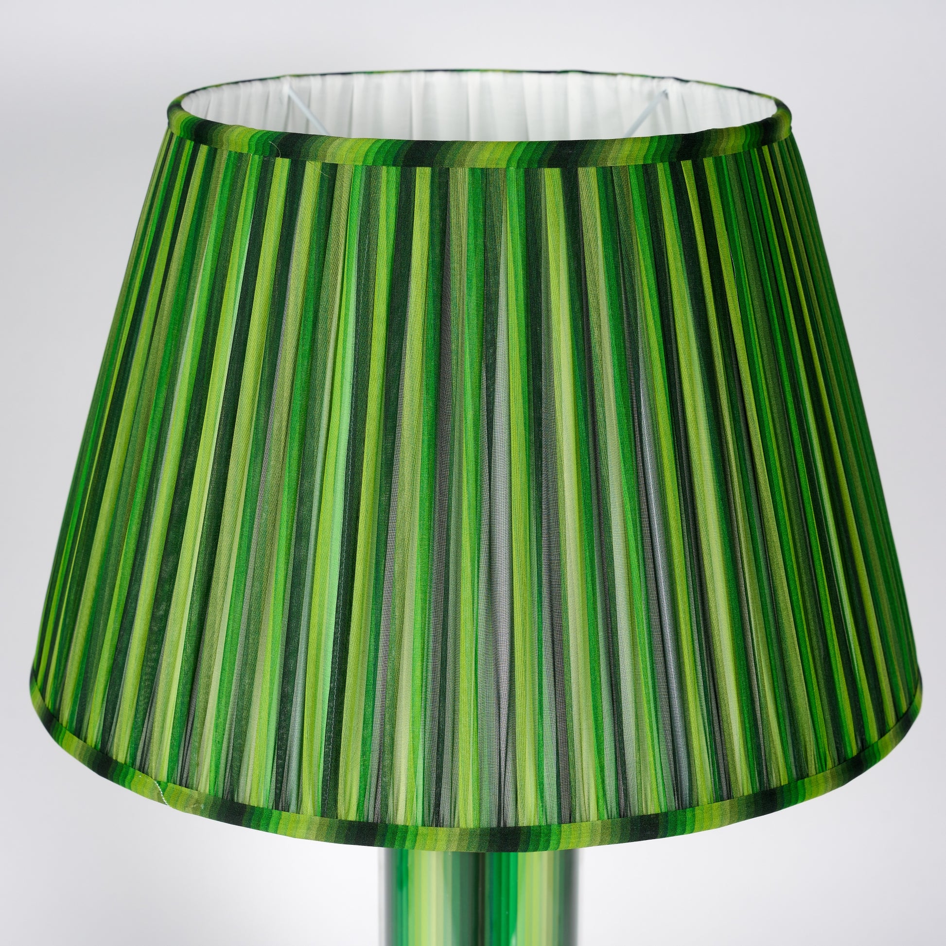 The lampshade is made of printed pleated silk georgette and it's dimensions are; Top 10.5" (17cm), Bottom 16" (40.5cm), Length from top to bottom 10.5" (17cm).