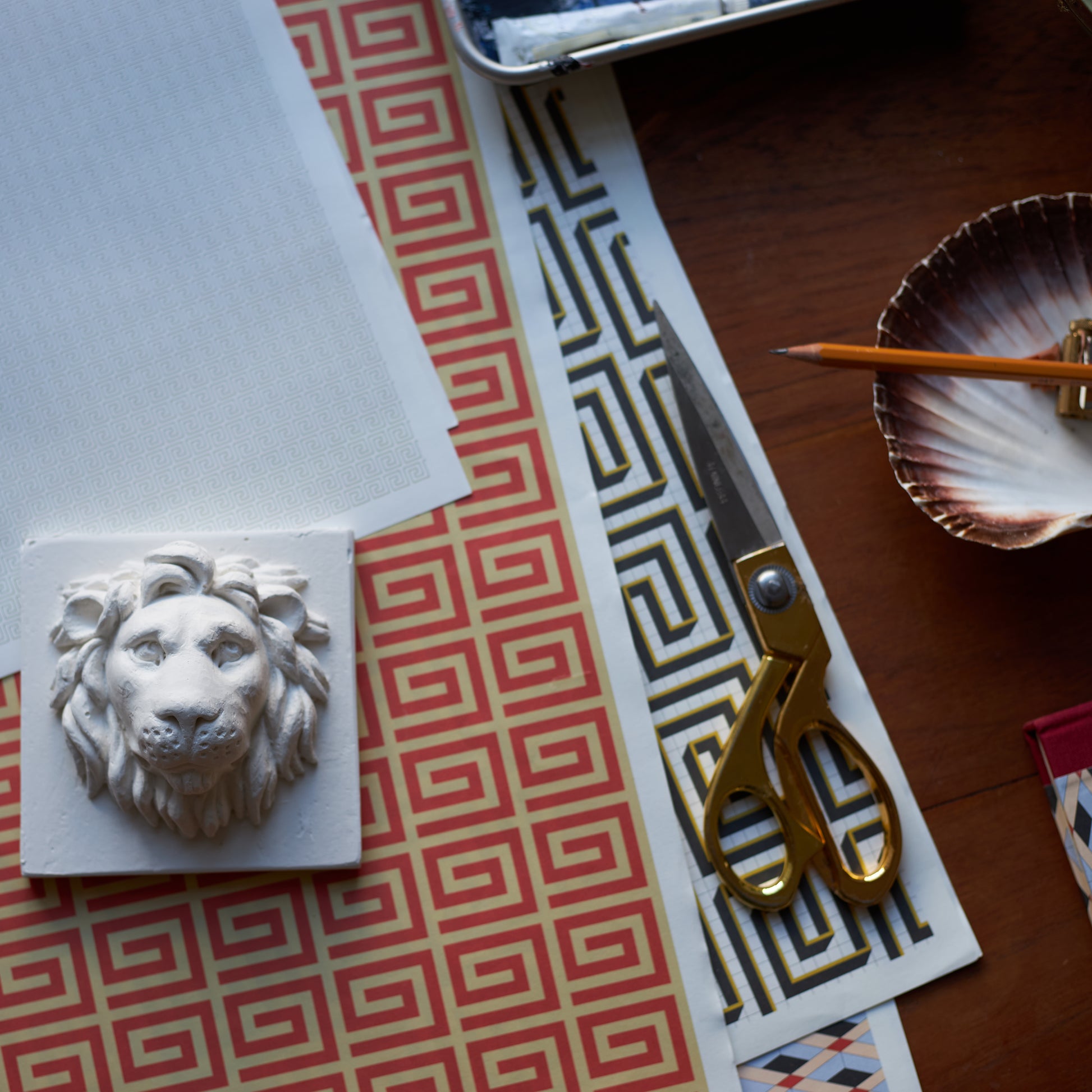 So inspired by the Opus Sectile (a practice dating back to antiquity) marble floors of St Mark’s Basilica in Venice, Bridie drew variations of her own. Unlike the Byzantines, she was fundamentally lacking in access to great quantities of precious marbles from the sacred and civic buildings of the Eastern Roman Empire, so she’s printed her collection out as a range of patterned papers instead!