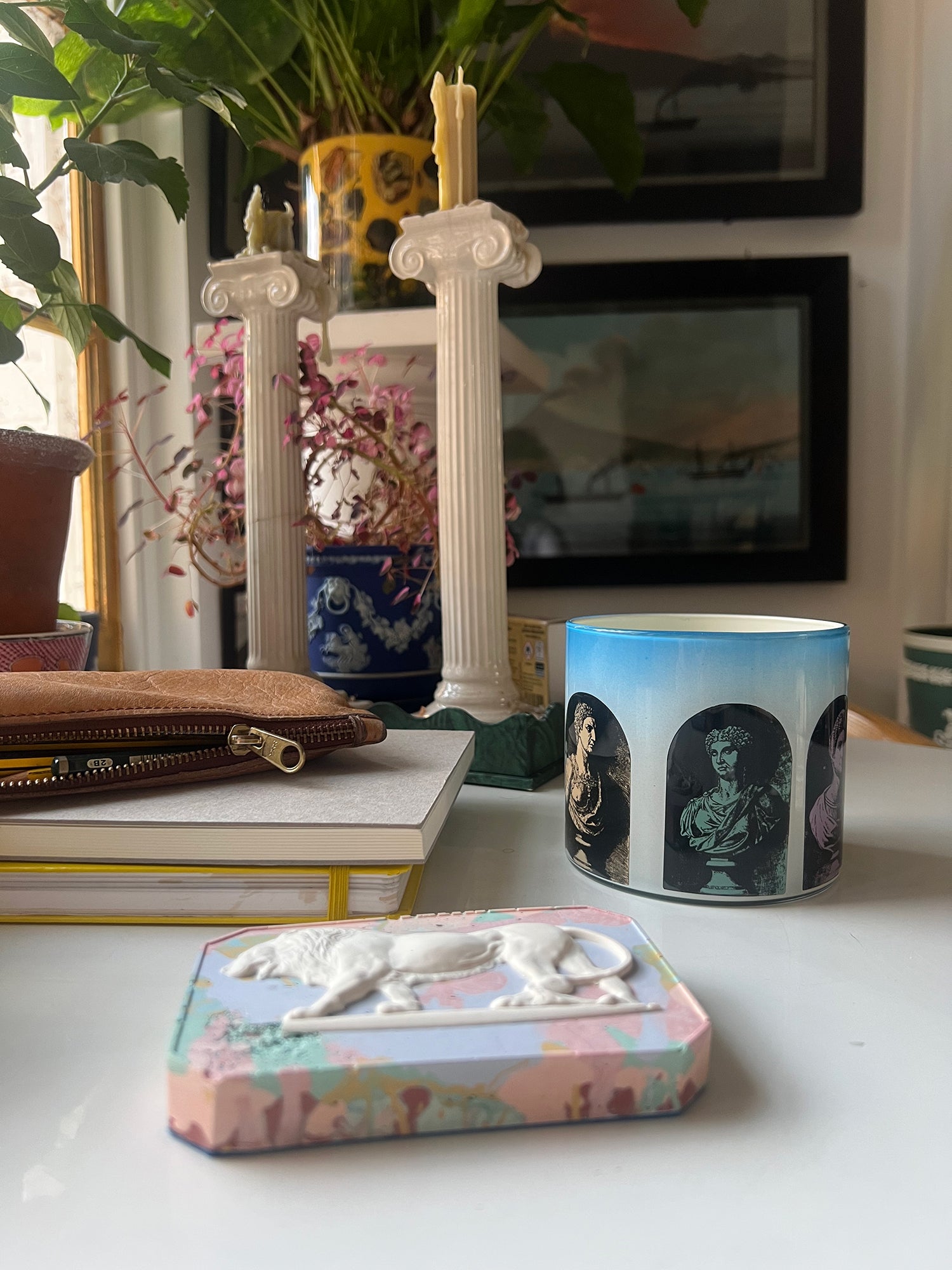 The Classical Alcove Picture Brush Pot. Made up of six different coloured images of classical busts nestled in their alcoves.