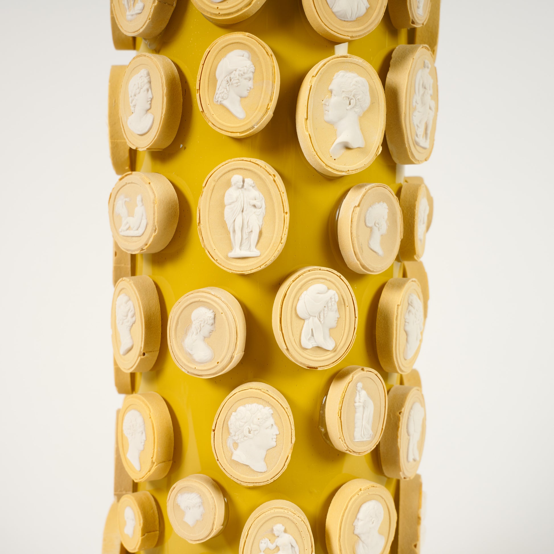 The strengthened glass columns are painted by Bridie then assembled with unfinished brass top and bottom plates. Over time the brass, if left unpolished, will develop a mellow patina making the colour of the column all the richer.