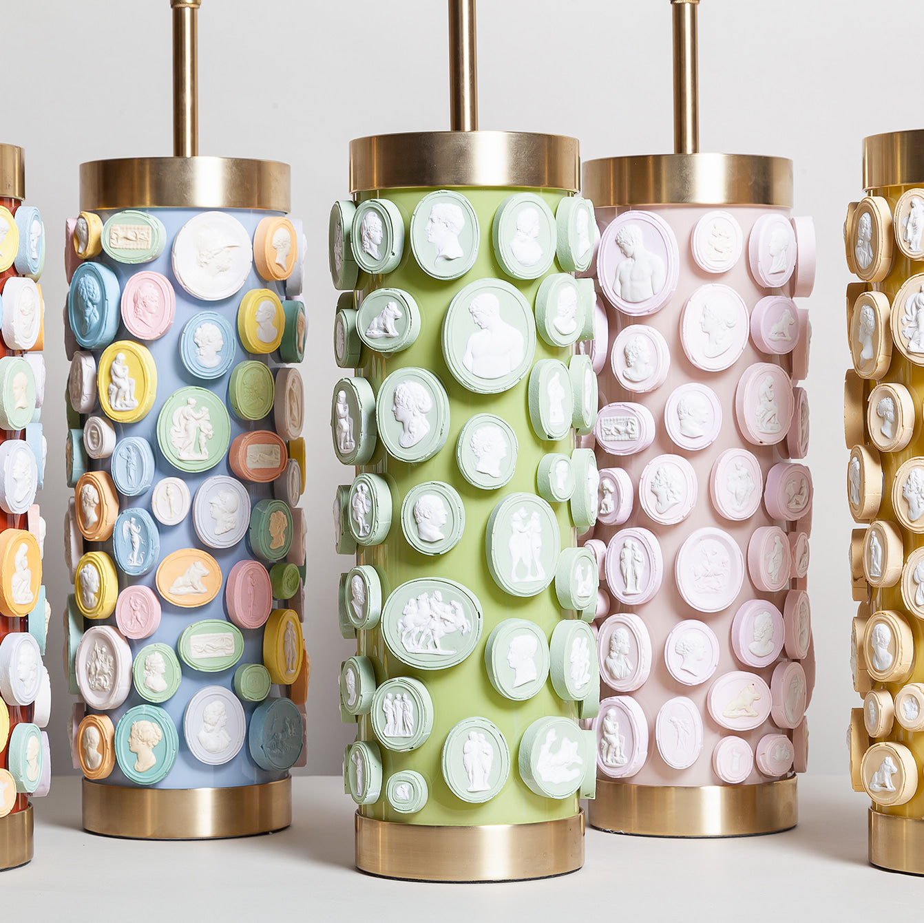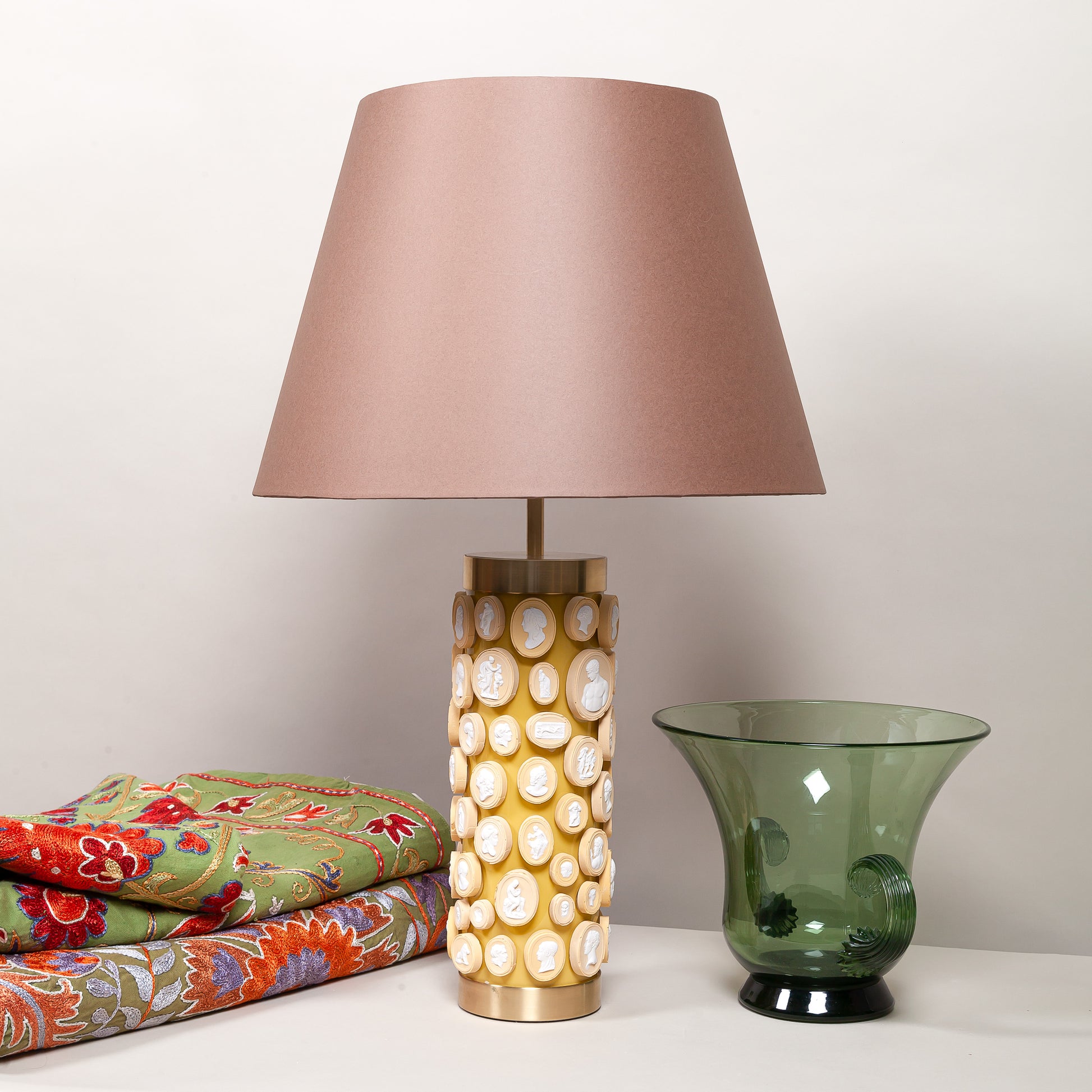 Colour is at the very heart of everything Bridie produces. Formerly a specialist painter of interiors, she has continued to keep up the practice through her homeware range. The latest of which are the glass & brass column lamp bases.