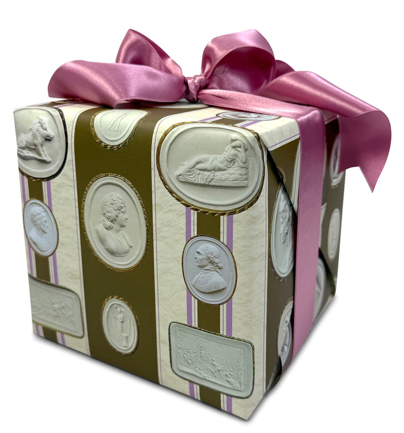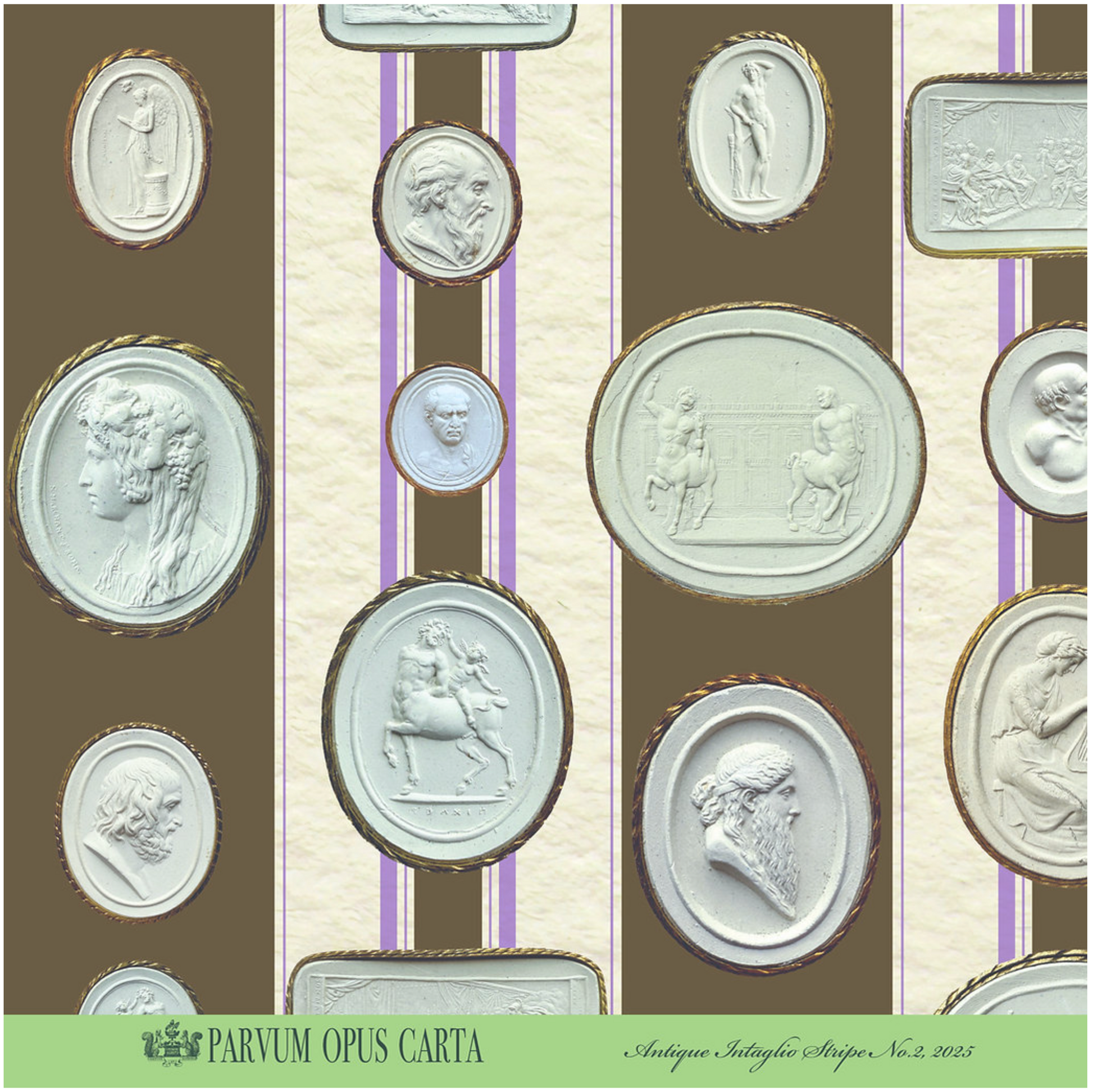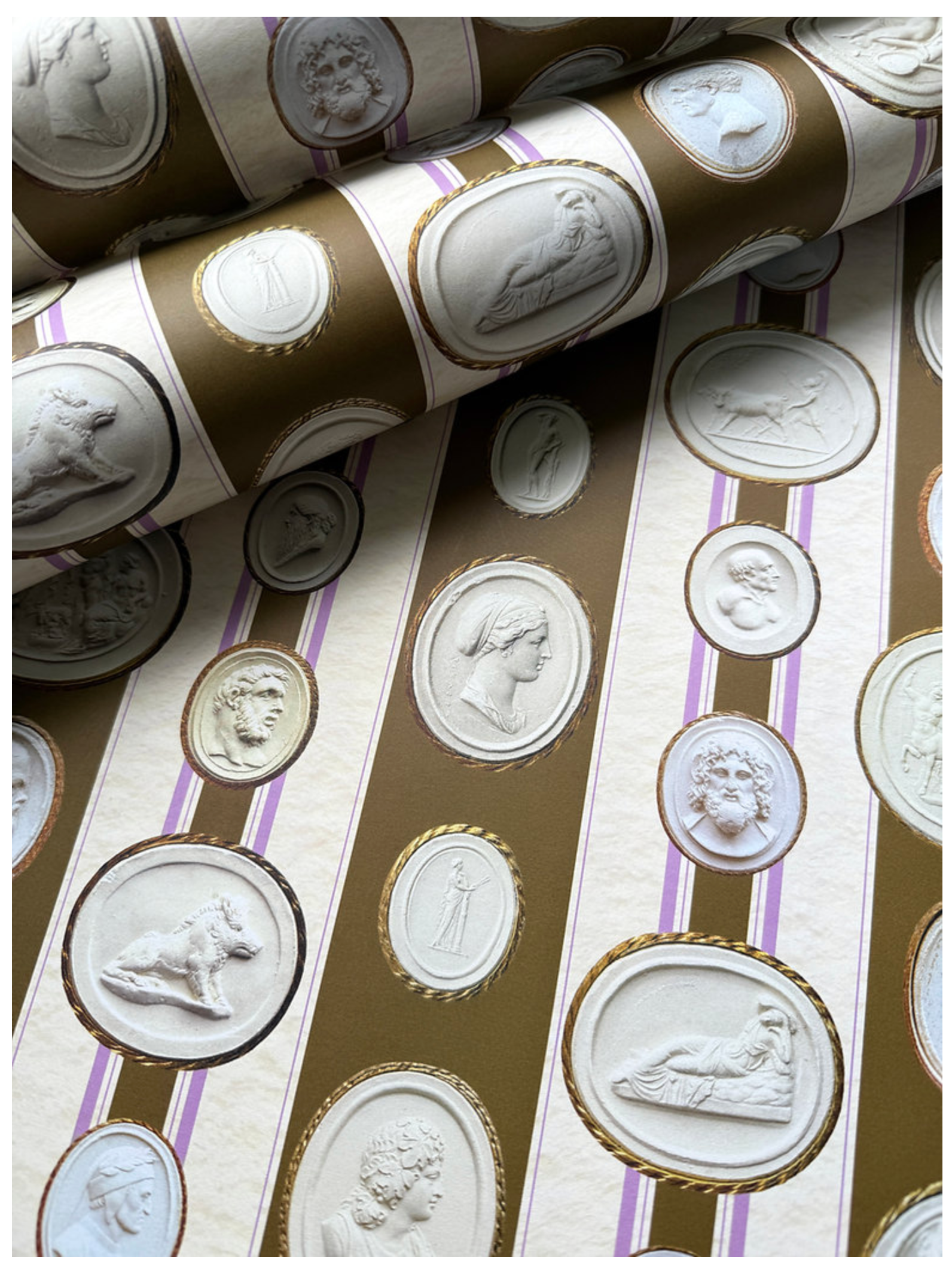 These papers include images of exquisite 19th century intaglios by Pietro Paoletti, arranged on a striped pattern whose colours were inspired by a classic Madeleine Castaing wallpaper.