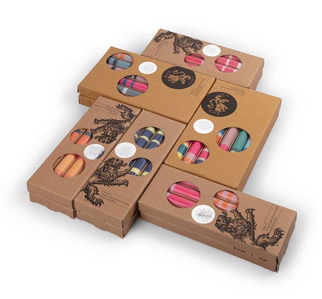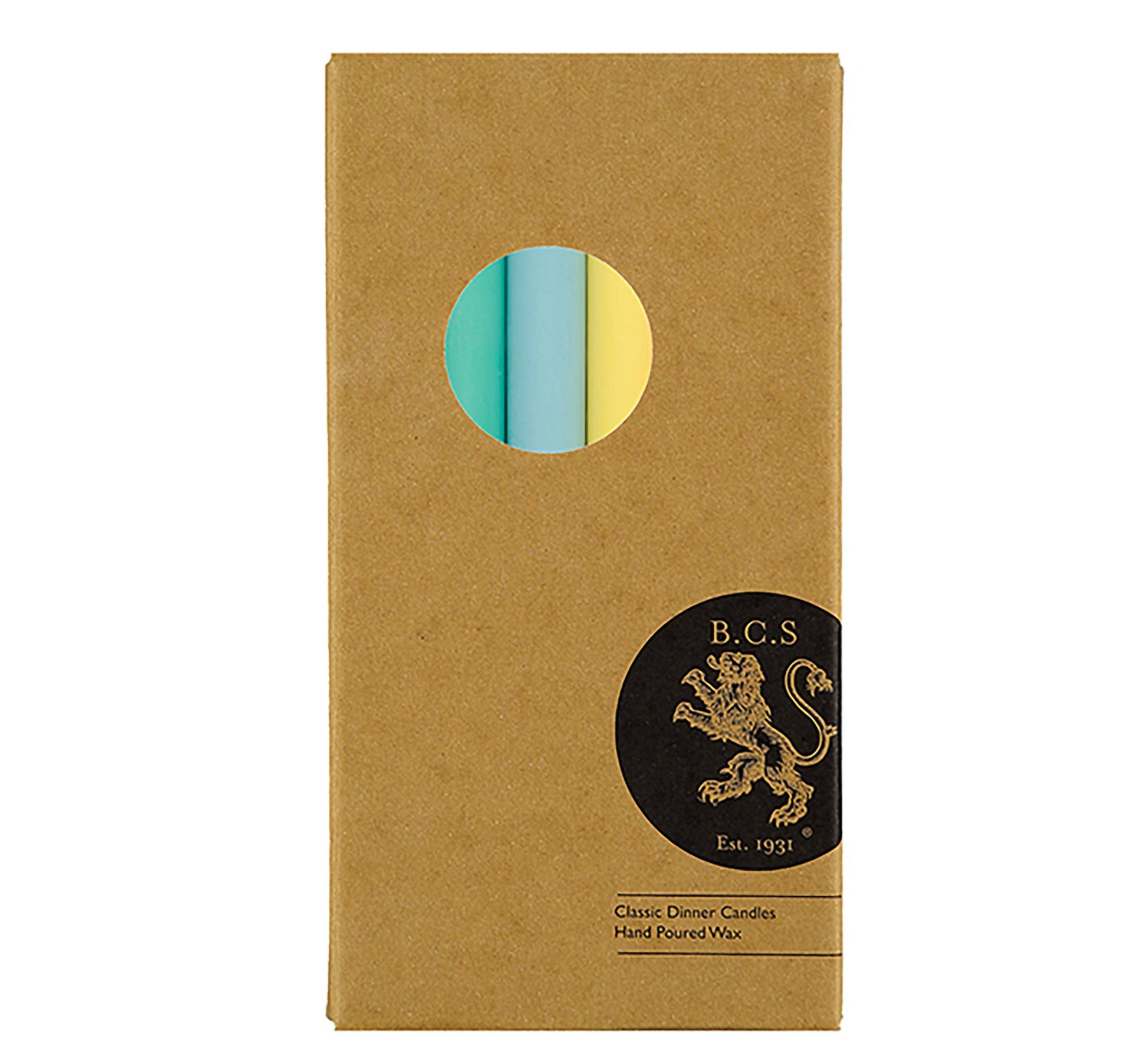Eco, fair trade dinner candles, here in a soft, pastel Rainbow of British Colour Standard Blossom, Coral, Powder,Turquoise, Primrose & Verbena Fresh, colours - ready to mix and match with our striped colour candles, these special, colourful candles make a wonderful present.