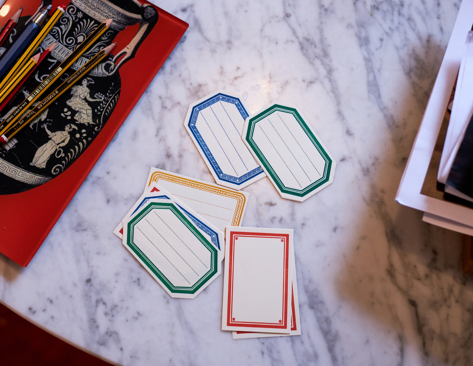 Inspired by old-school schoolbooks, our bookplates are letterpress printed on Conqueror paper and come in four different borders: orange stars, blue Greek key, yellow rope and green band. Made in bracing Bognor Regis, they are ungummed, so get your glue pot out and stick them to whatever comes to mind, whether it’s a recipe book or a diary or your secret album of John Travolta photographs.