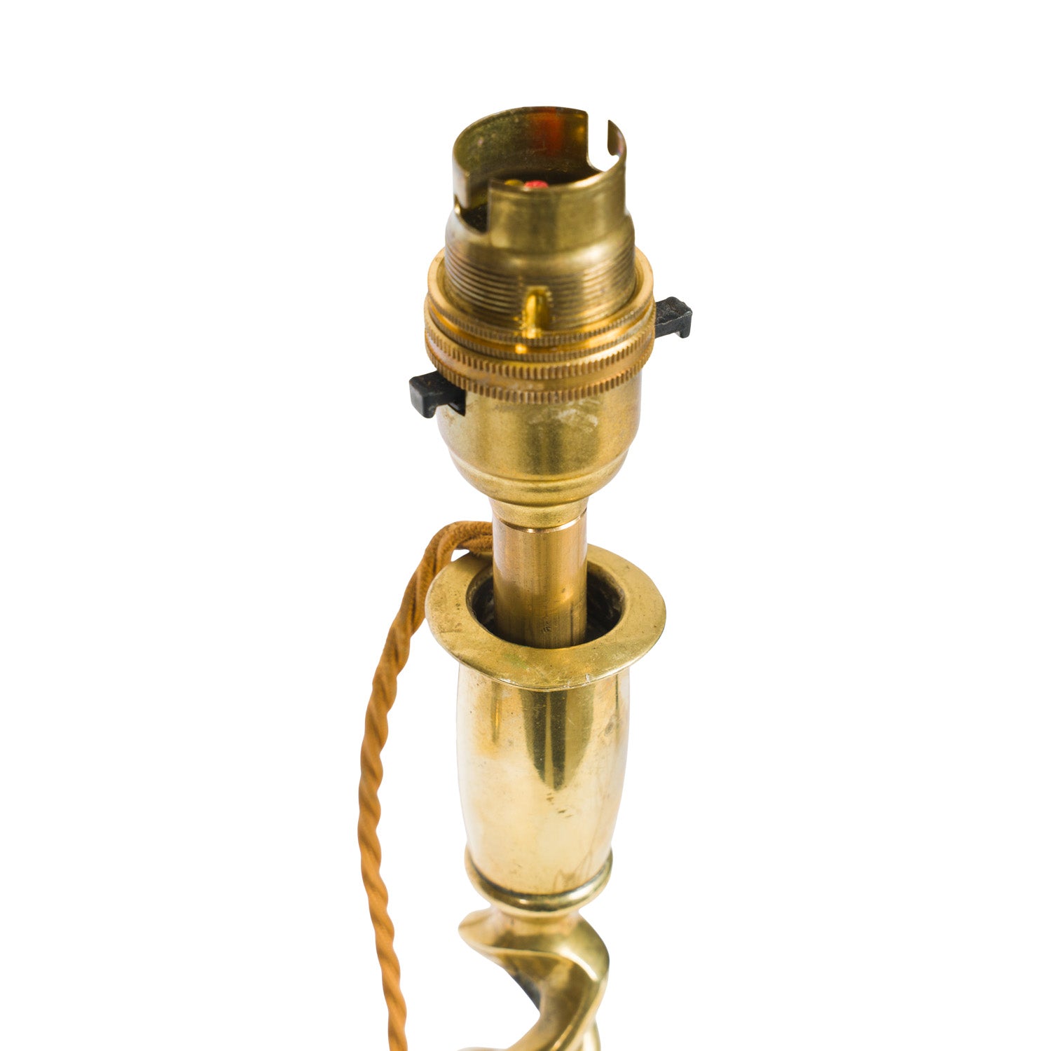 A pair of English 19th Century antique brass candlesticks which have been converted into lamps, with brown silk flex.