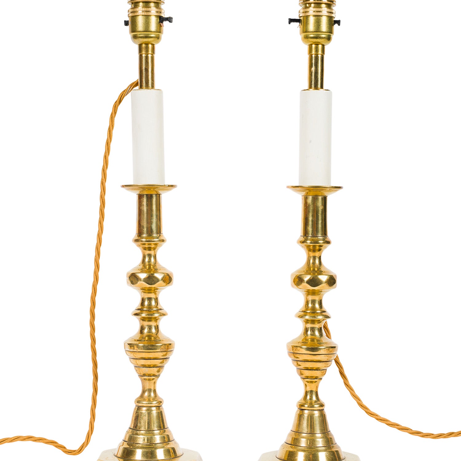 A pair of tall English 19th Century antique brass candlesticks which have been converted into lamps, with white card 'candlesleeves' and brown silk flex.