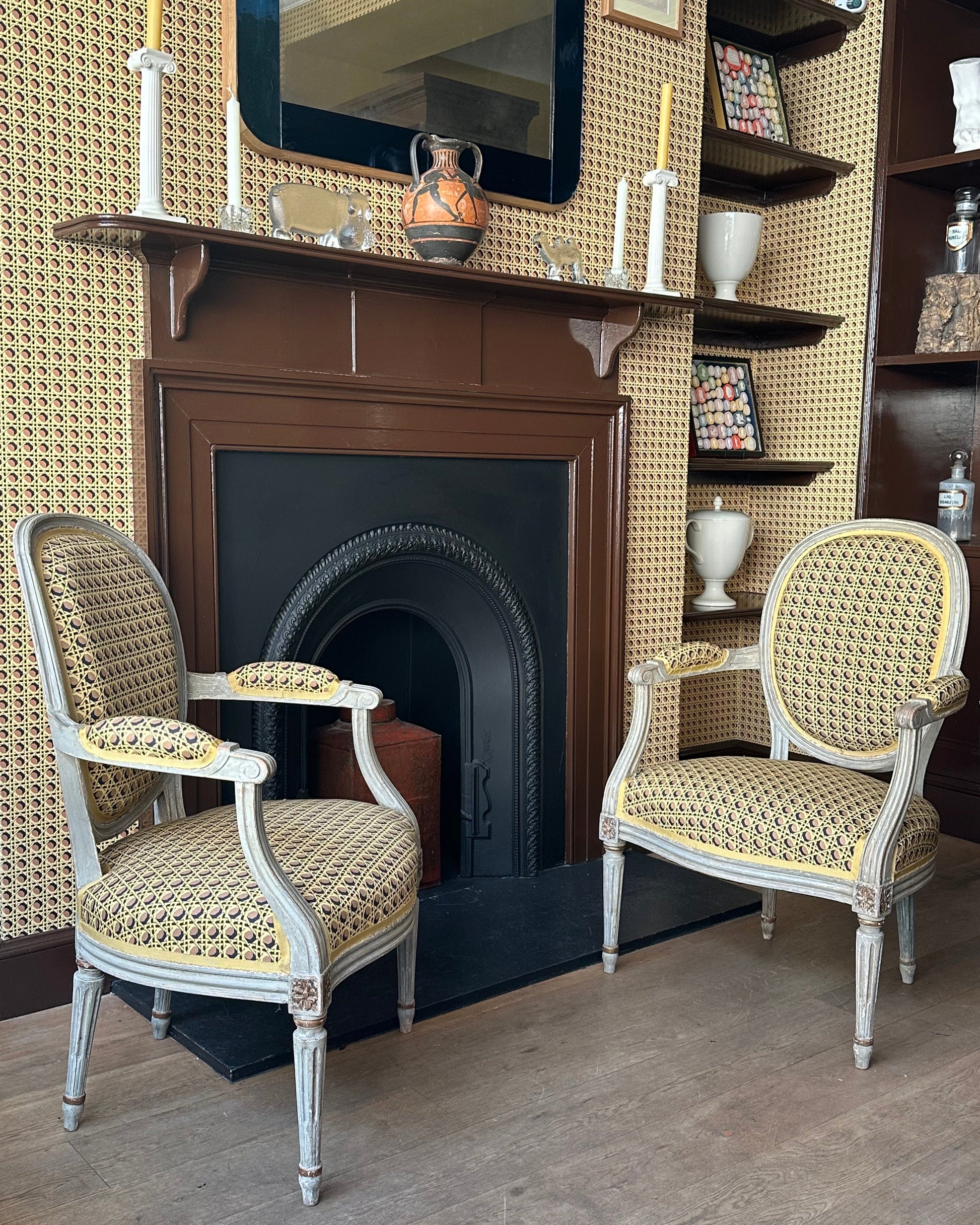 Now covered with our Regency Caning fabric in Jasperware Red and finished with a braid trim.