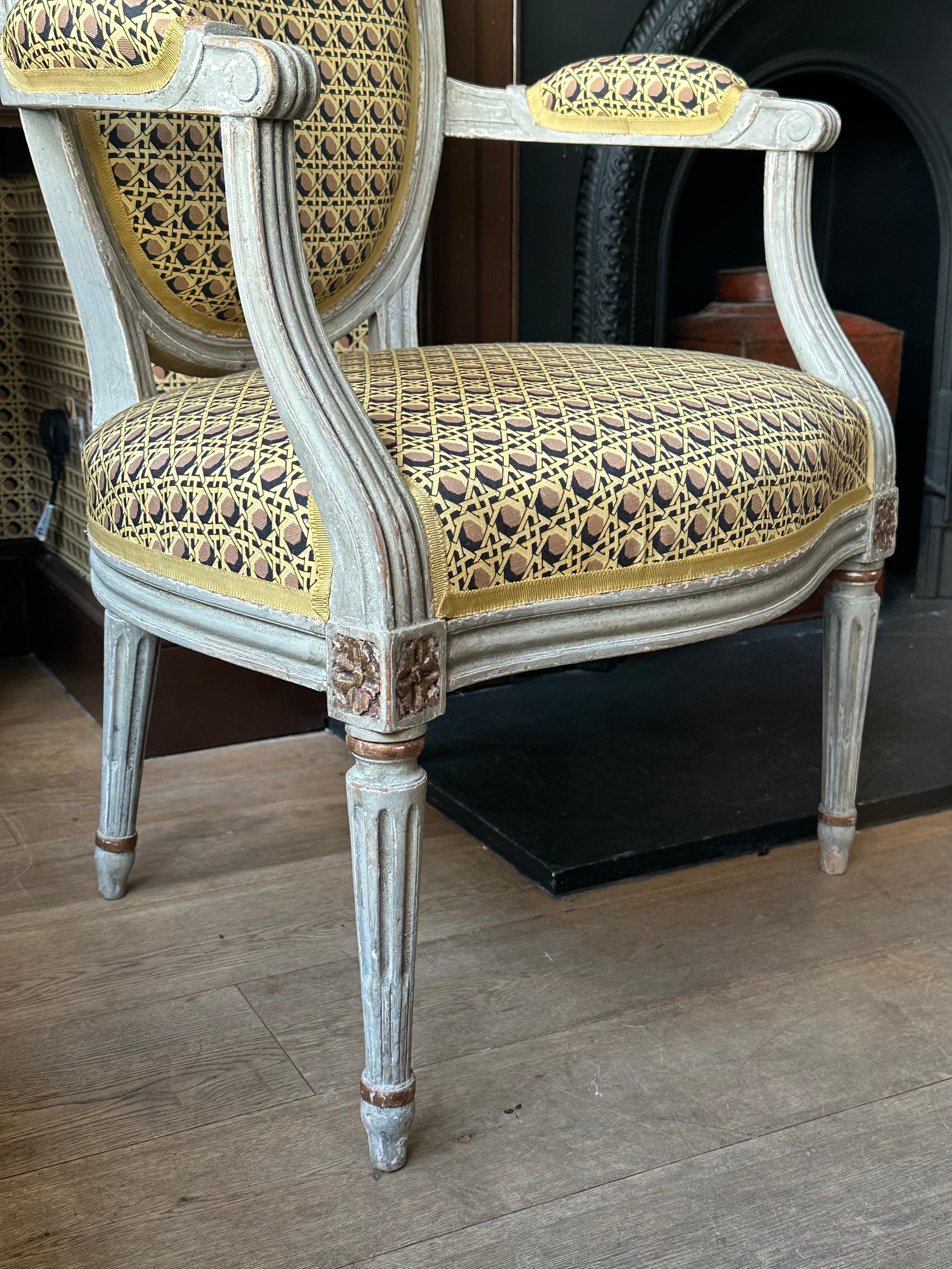19th Century French carved wood open arm salon chairs; painted with gilded details.
