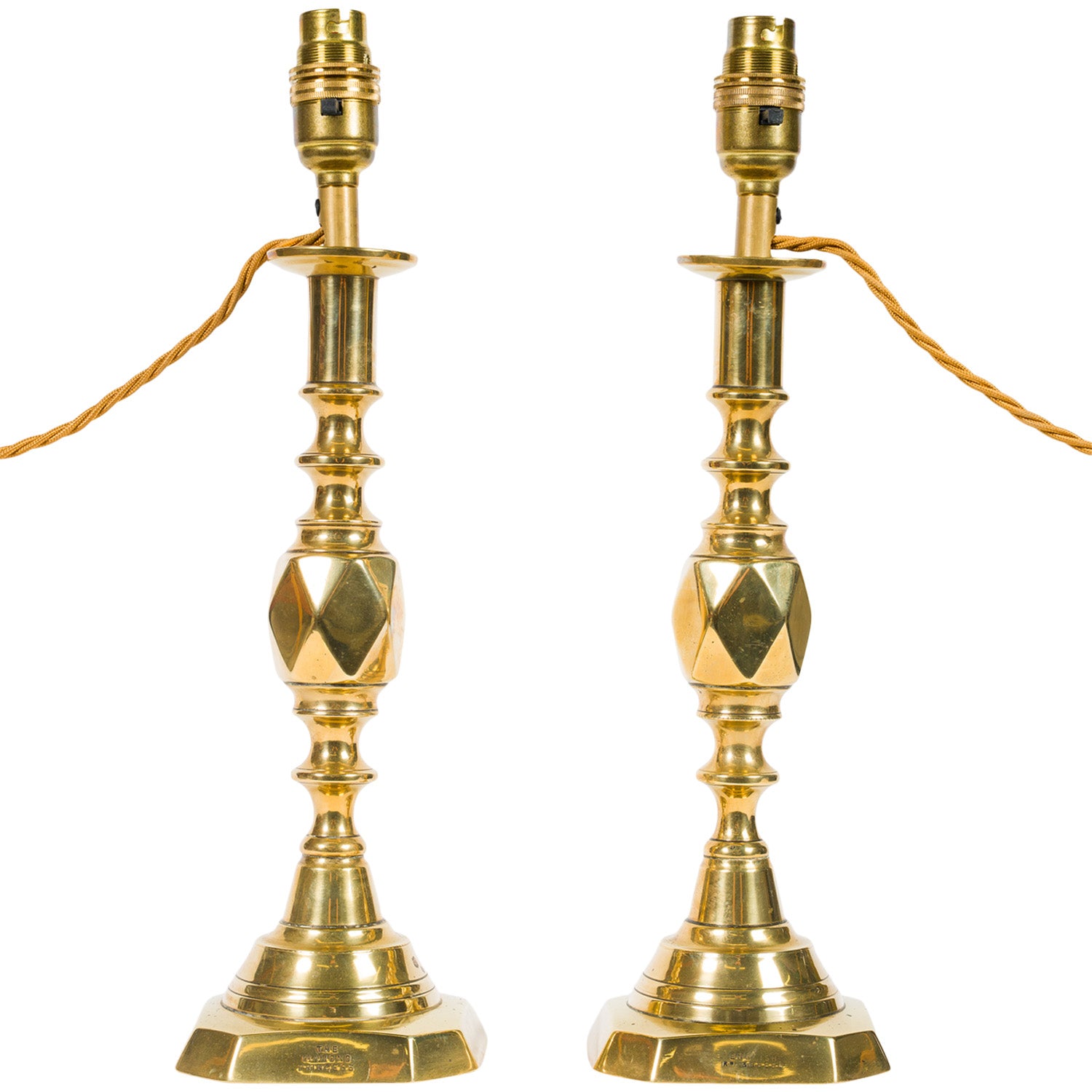 A pair of English 19th Century antique brass candlesticks which have been converted into lamps, with brown silk flex.