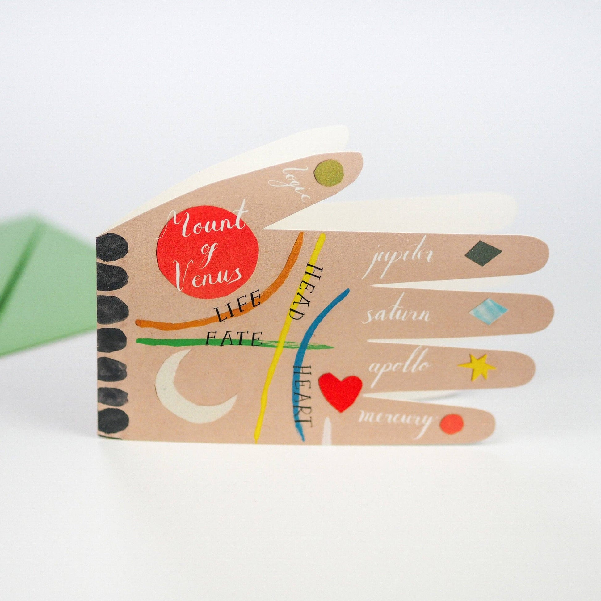 A fun and colourful hand-shaped design, depicting the palm reading essentials.