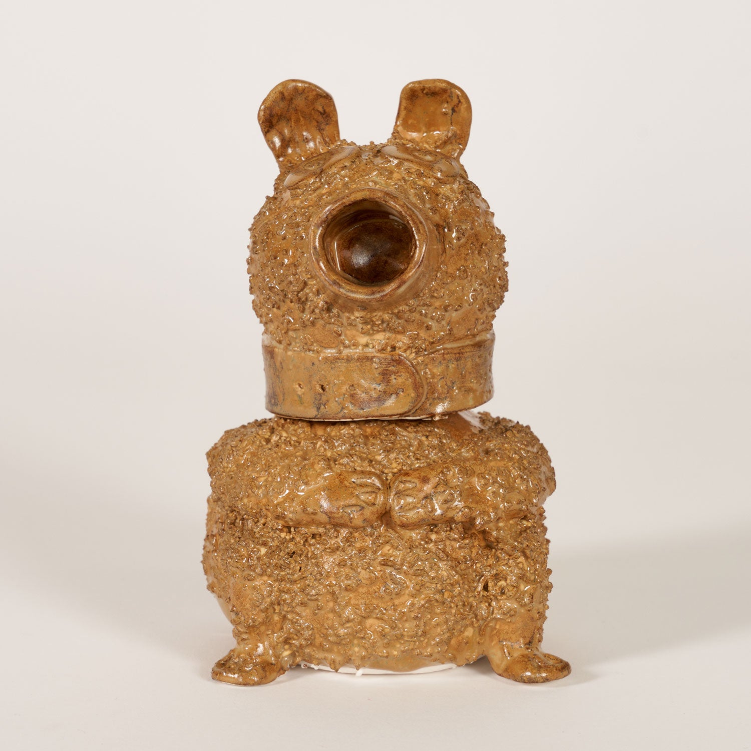 The whimsical nature of my C18th inspirations portray the cruel yet popular sport of bear-baiting, a legal recreation in England until 1835. Made as souvenirs, they served as bottles, jugs and tobacco jars. The body of the bottle held the liquid contents while the head covered the opening and provided a drinking cup. Quite a social commentary of the time.