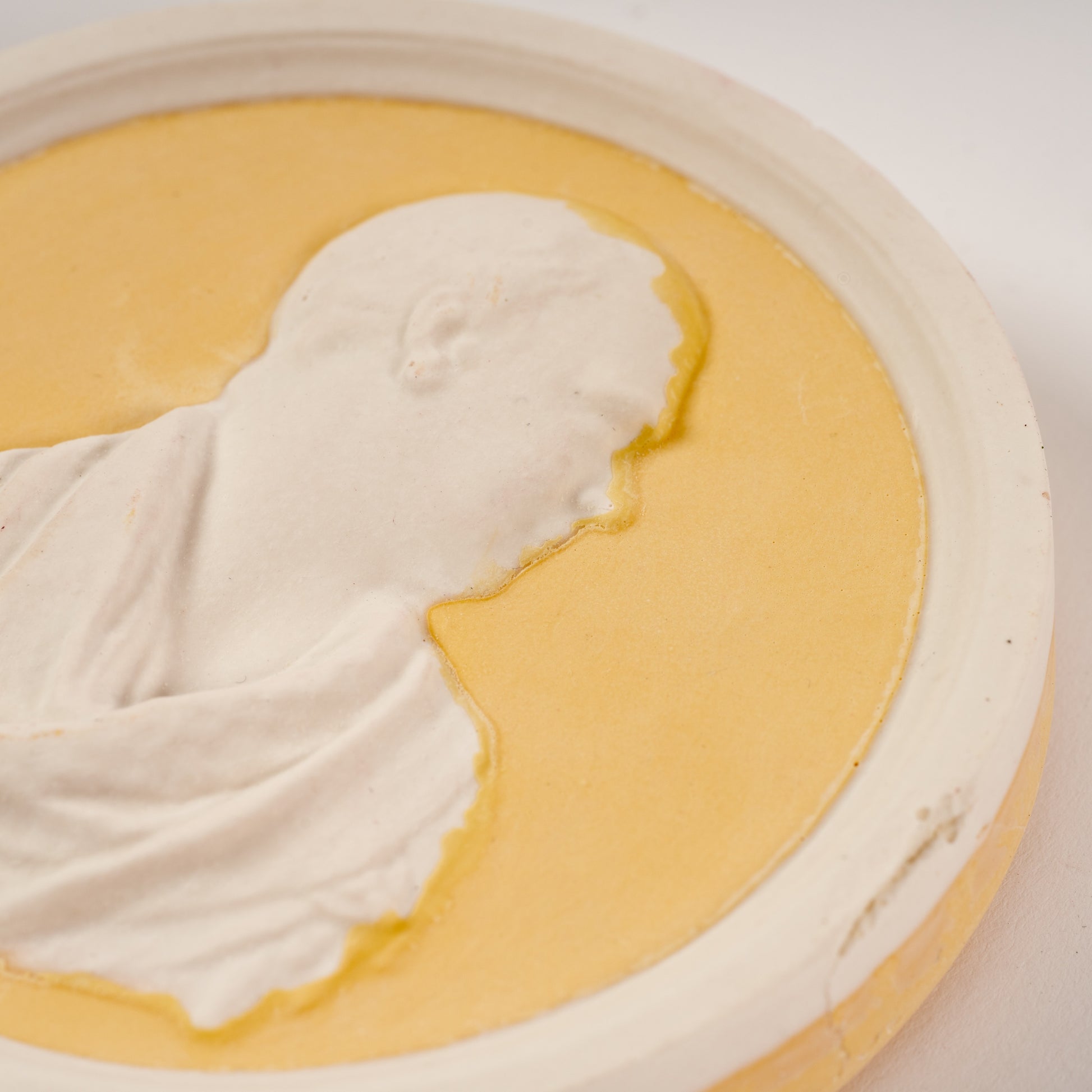 A two colour circular bas-relief portrait plaque cast in jesmonite and fitted with a small plate disc for hanging.