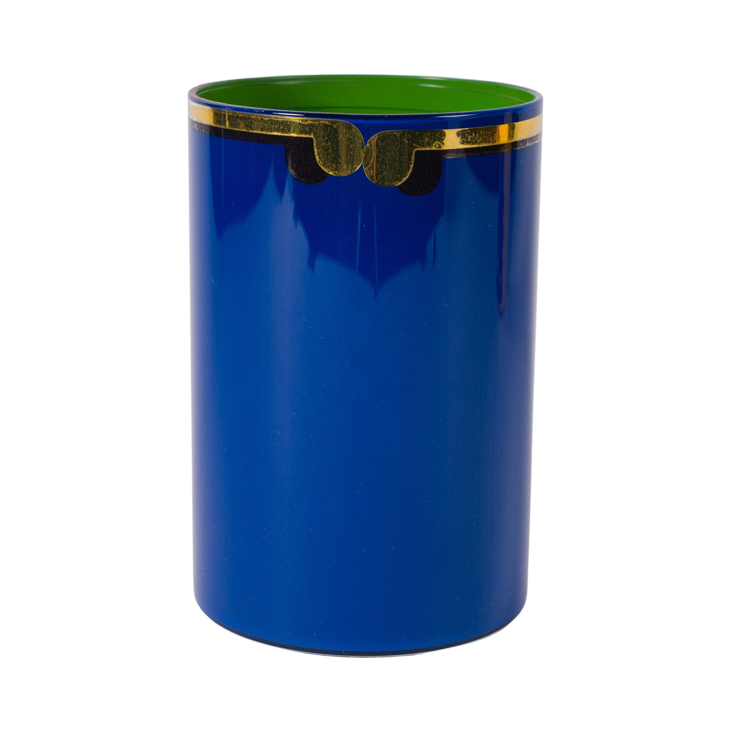 Smooth glass tumblers inlaid with a gold vinyl letter or symbol, backed with a different coloured lacquer and a topcoat of glossy varnish. They are for decorative use only and are not suitable for food consumption. Whilst durable, the lacquers are water-soluble so if they were ever to be used to hold a posy of flowers (which is a fabulous idea) the best thing is to put a small jar of water inside.