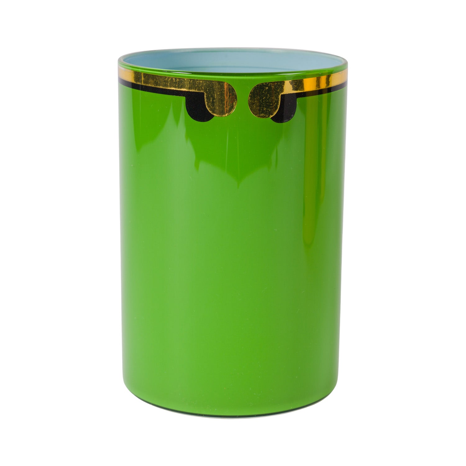Smooth glass tumblers inlaid with a gold vinyl letter or symbol, backed with a different coloured lacquer and a topcoat of glossy varnish. They are for decorative use only and are not suitable for food consumption. Whilst durable, the lacquers are water-soluble so if they were ever to be used to hold a posy of flowers (which is a fabulous idea) the best thing is to put a small jar of water inside.