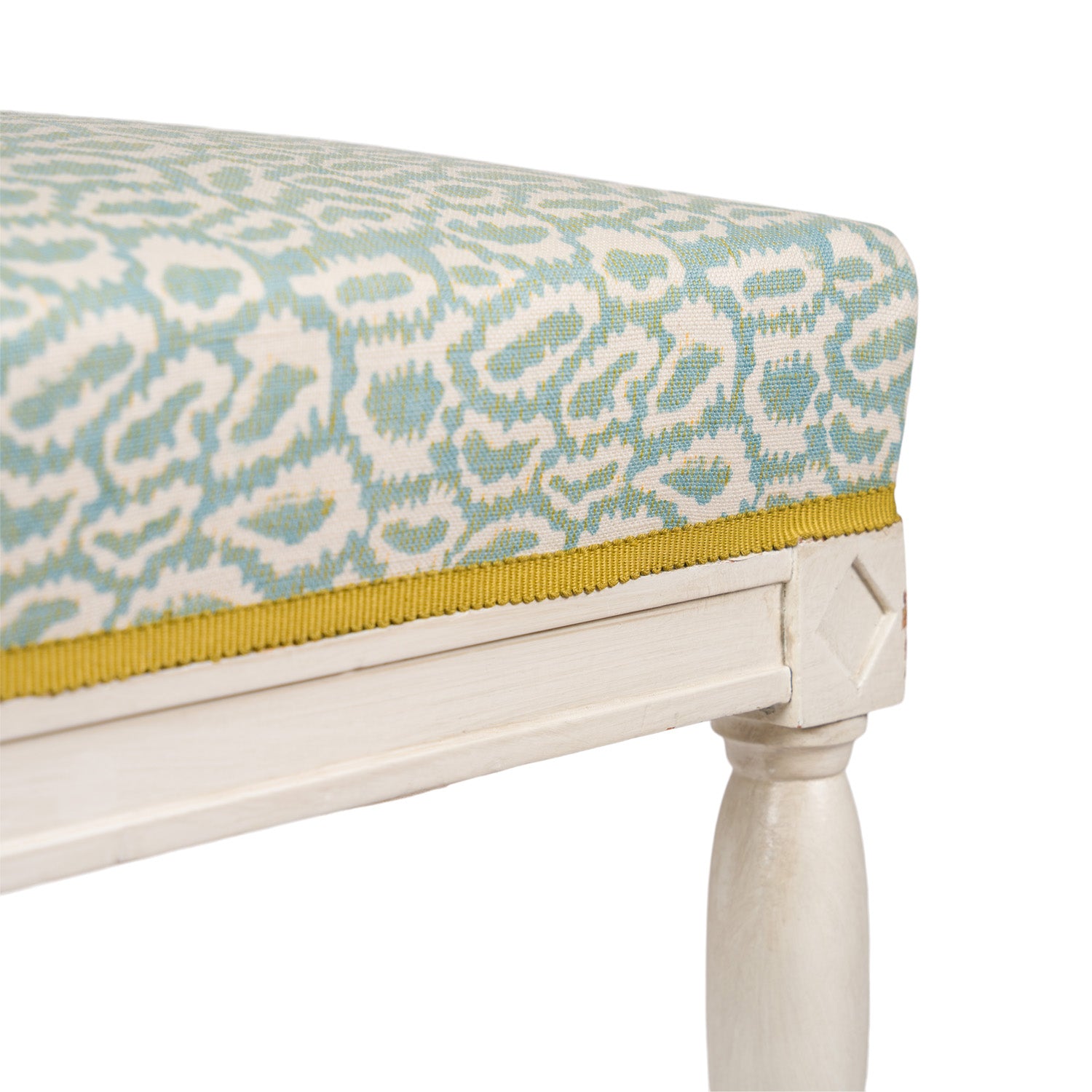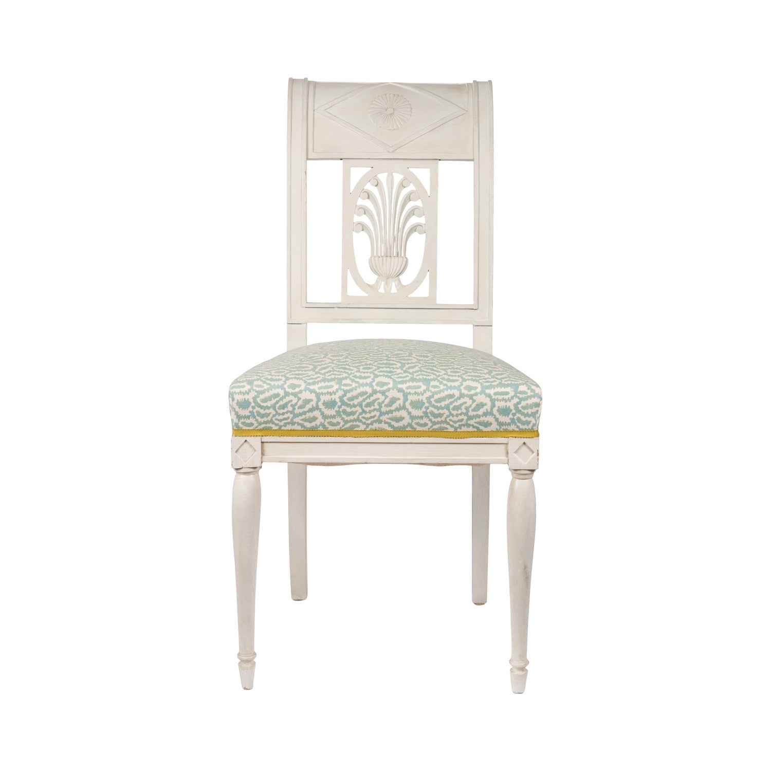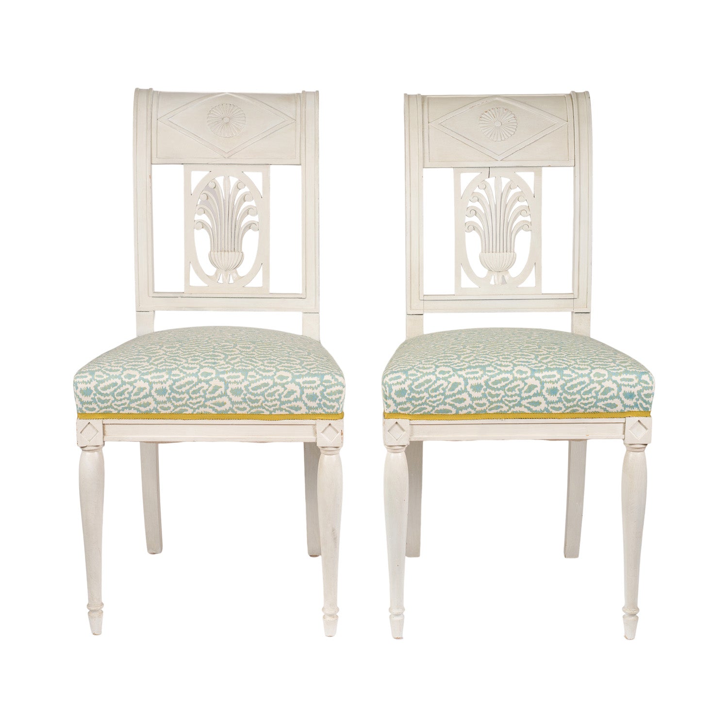 Specialist painted carved wooden 1920's dining chairs. Upholstered using Michael S. Smith fabric and finished with a George Spencer braid.