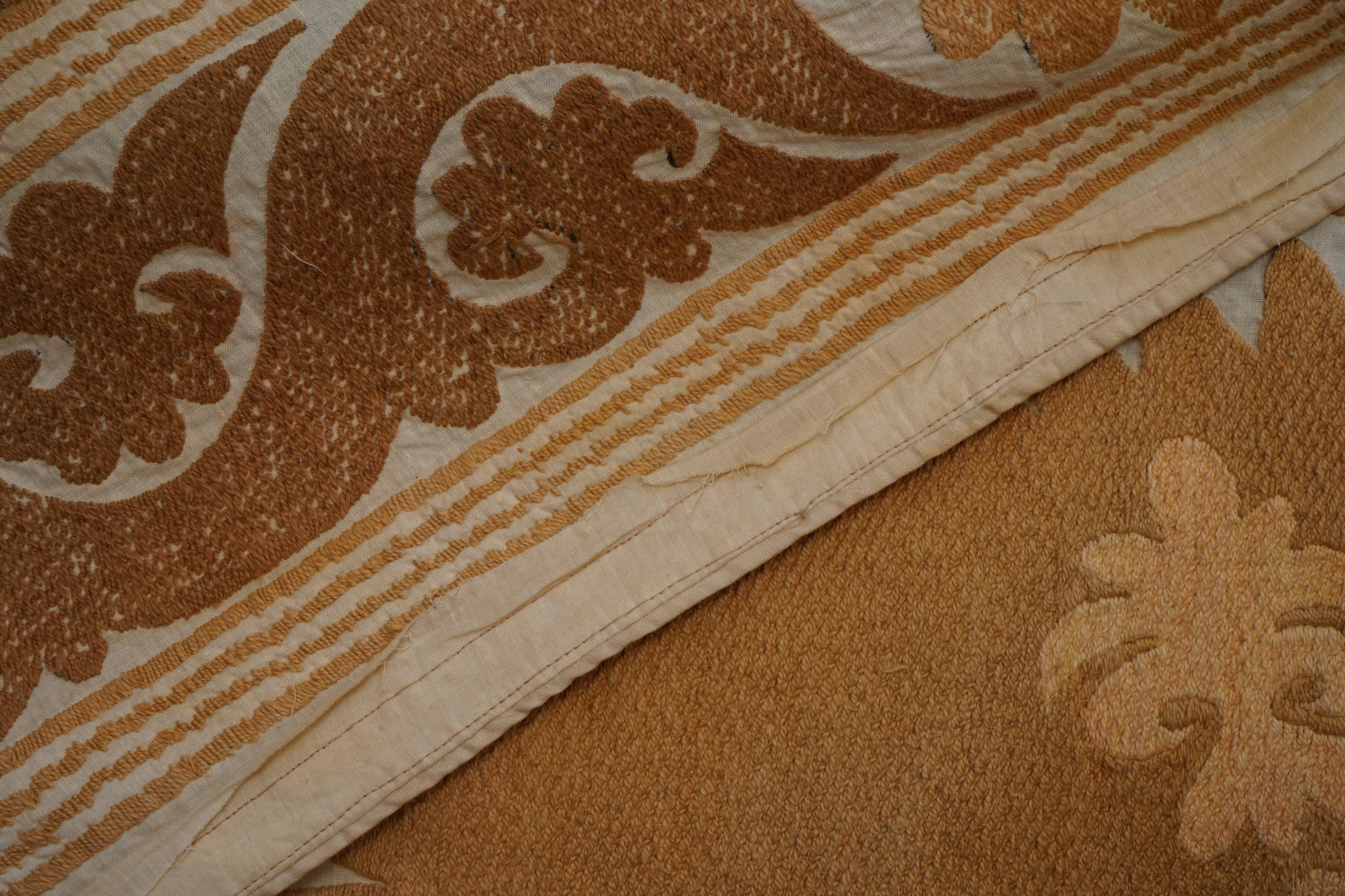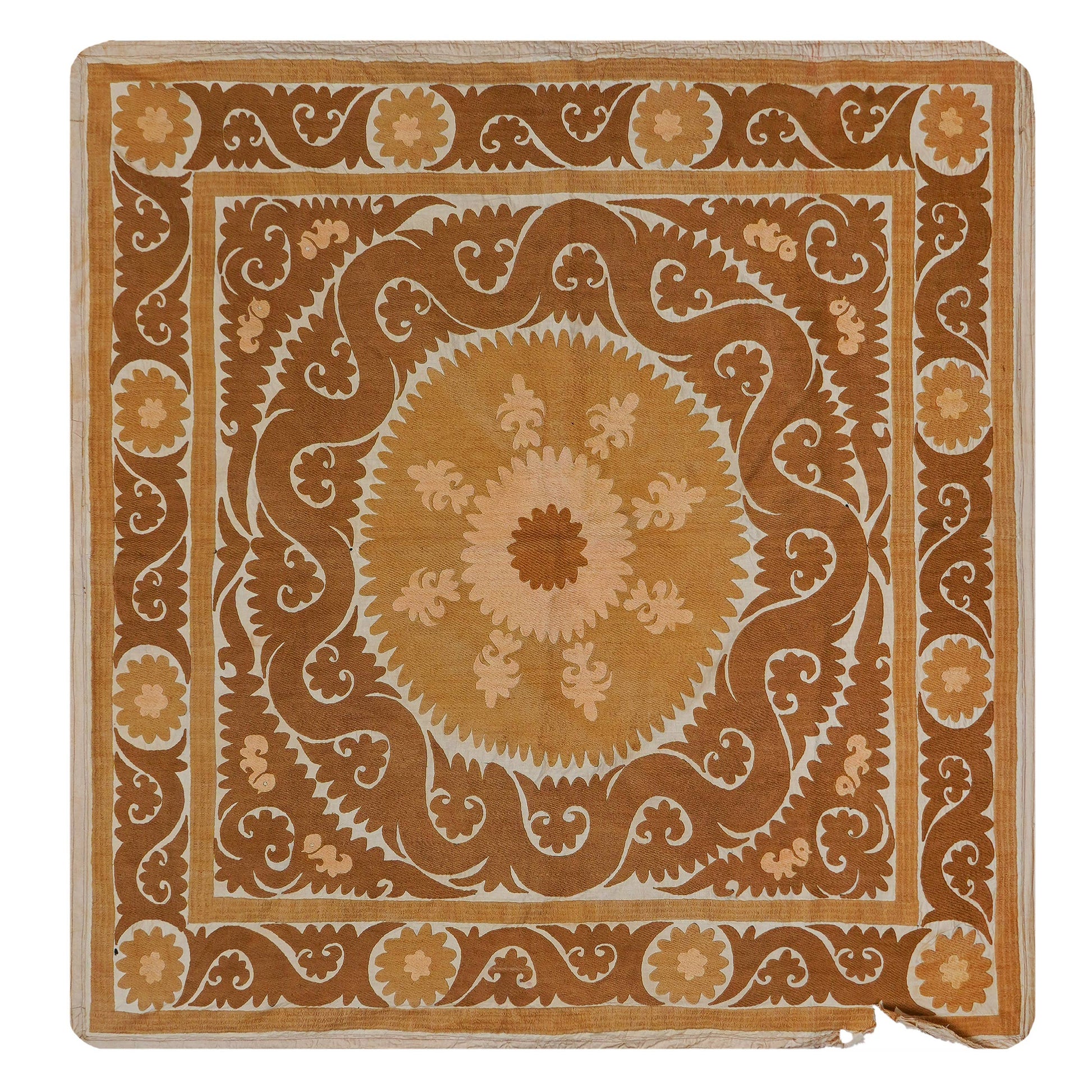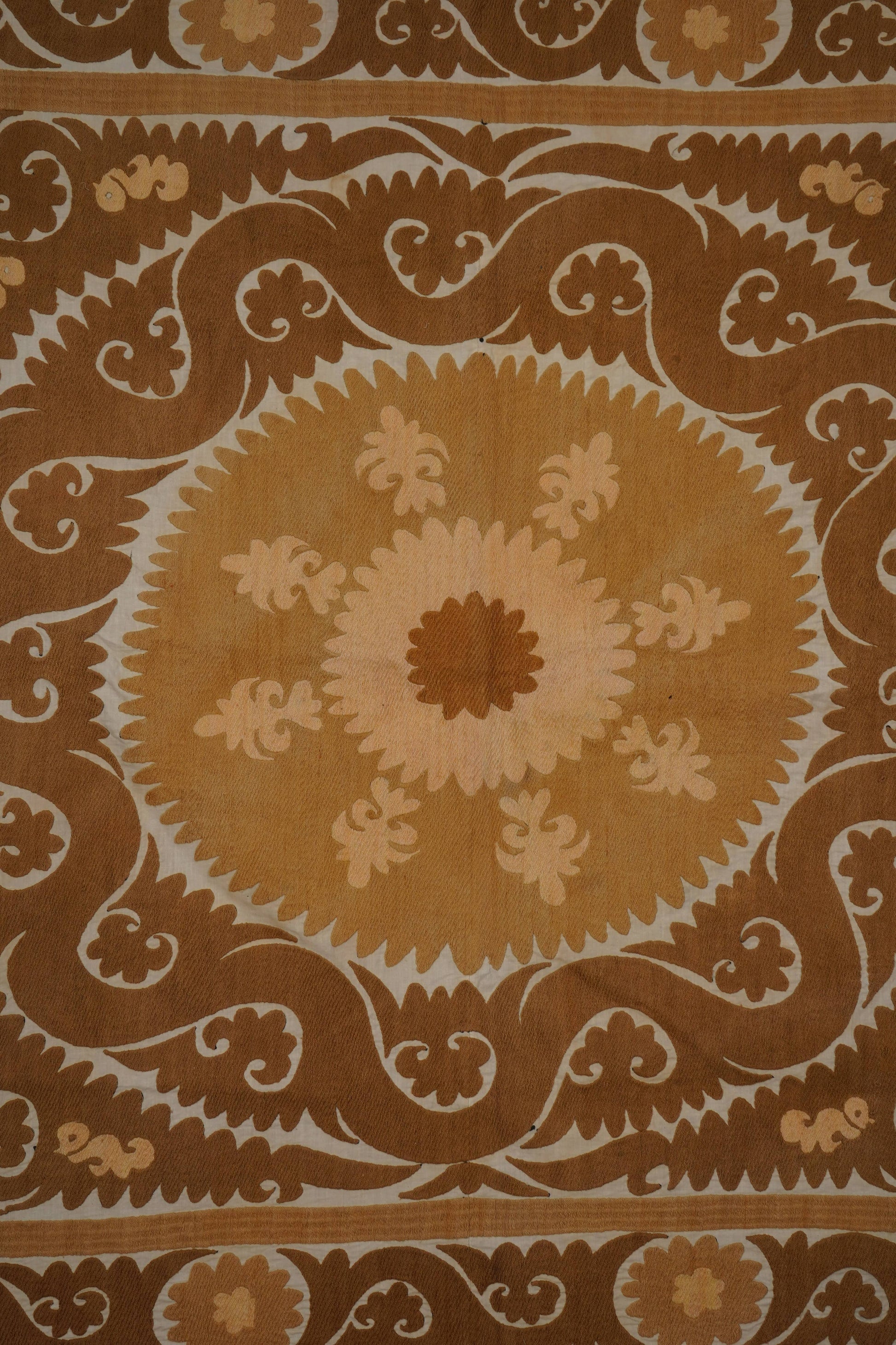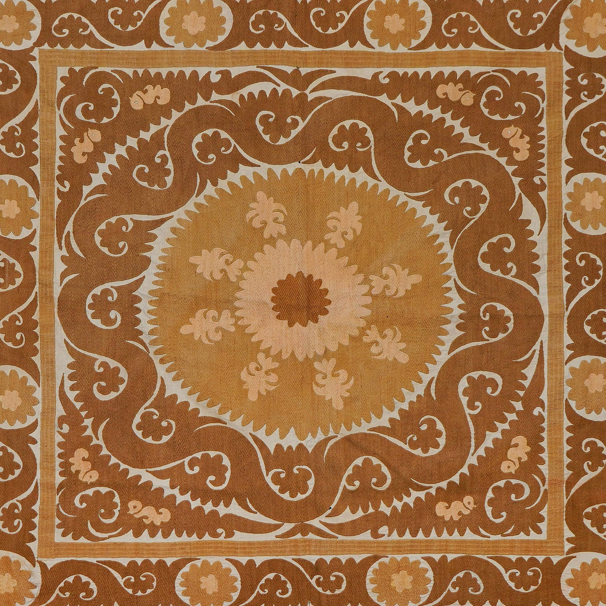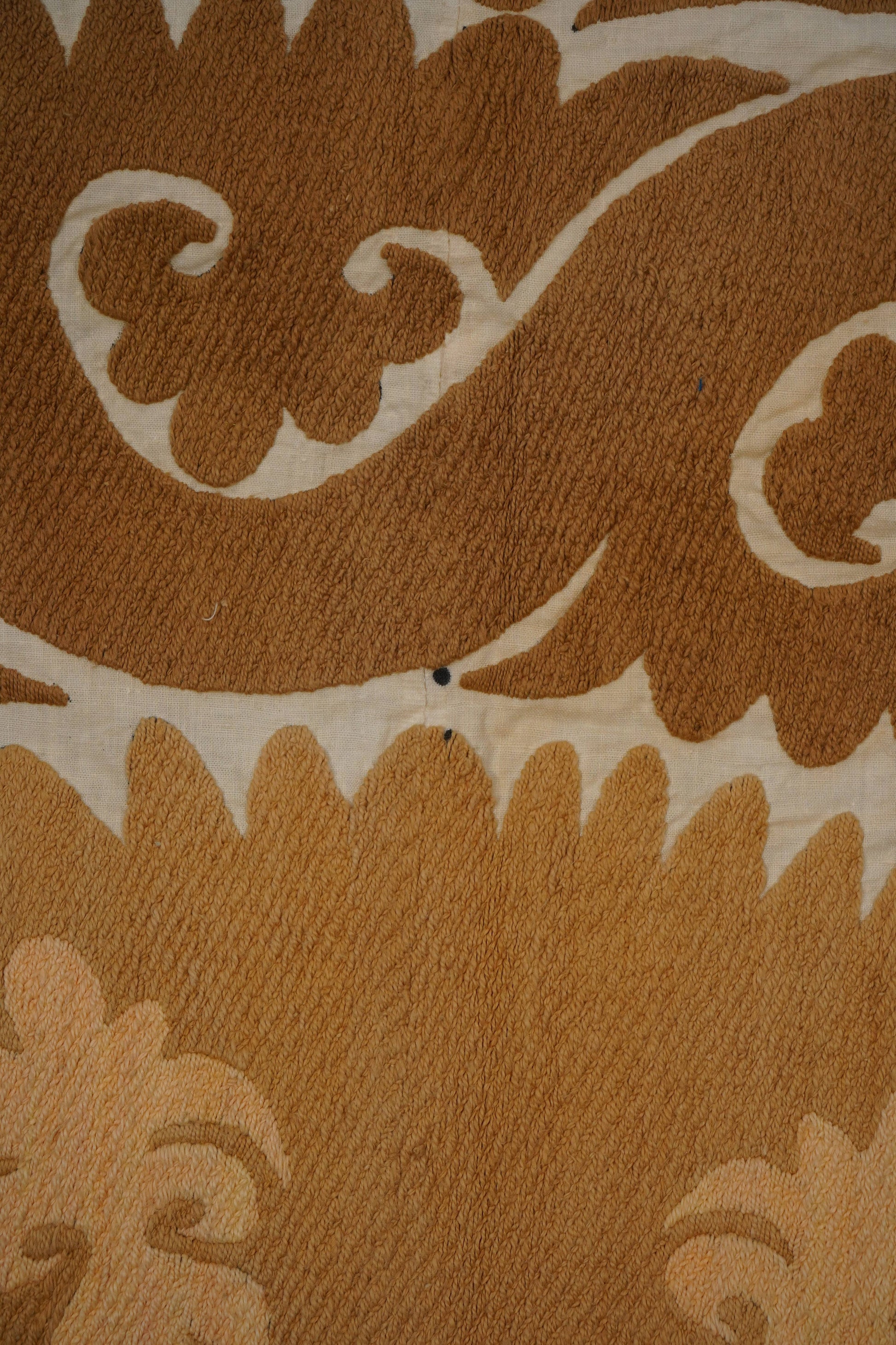 There are variations in the shade of the thread used to embroider this, as is commonly seen in older suzanis that were made for personal use in people’s homes. Embroidery on a cotton base. While this suzani is in wonderful condition, there are small tears and signs of wear on this suzani, that are to be expected with vintage pieces.