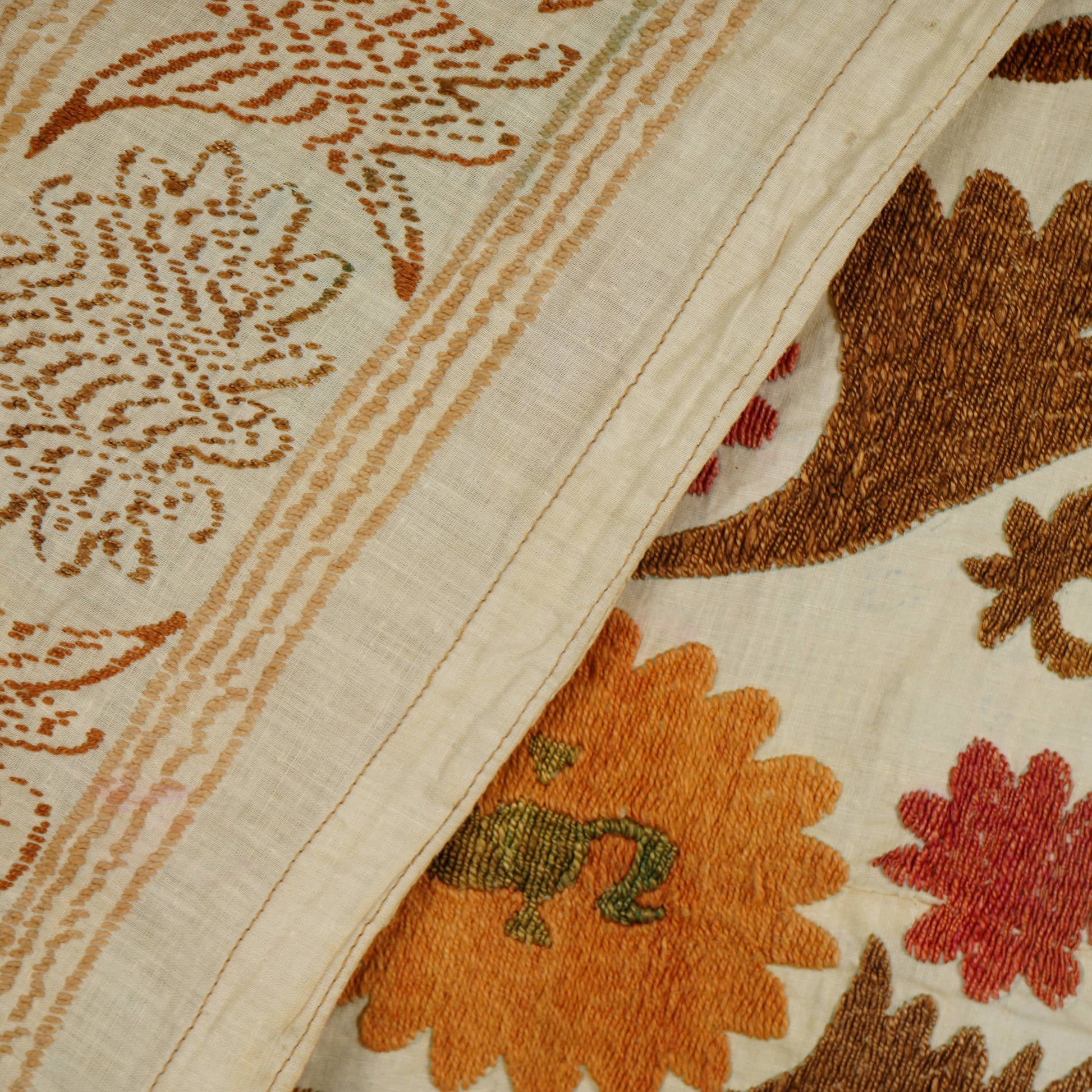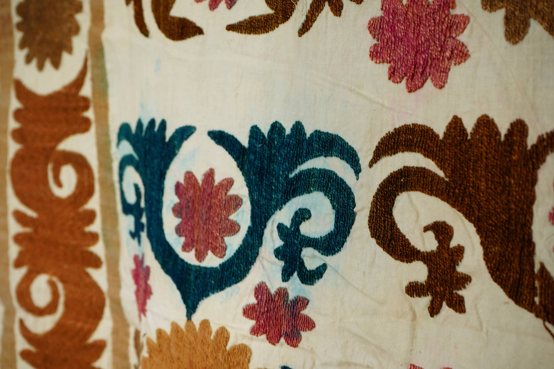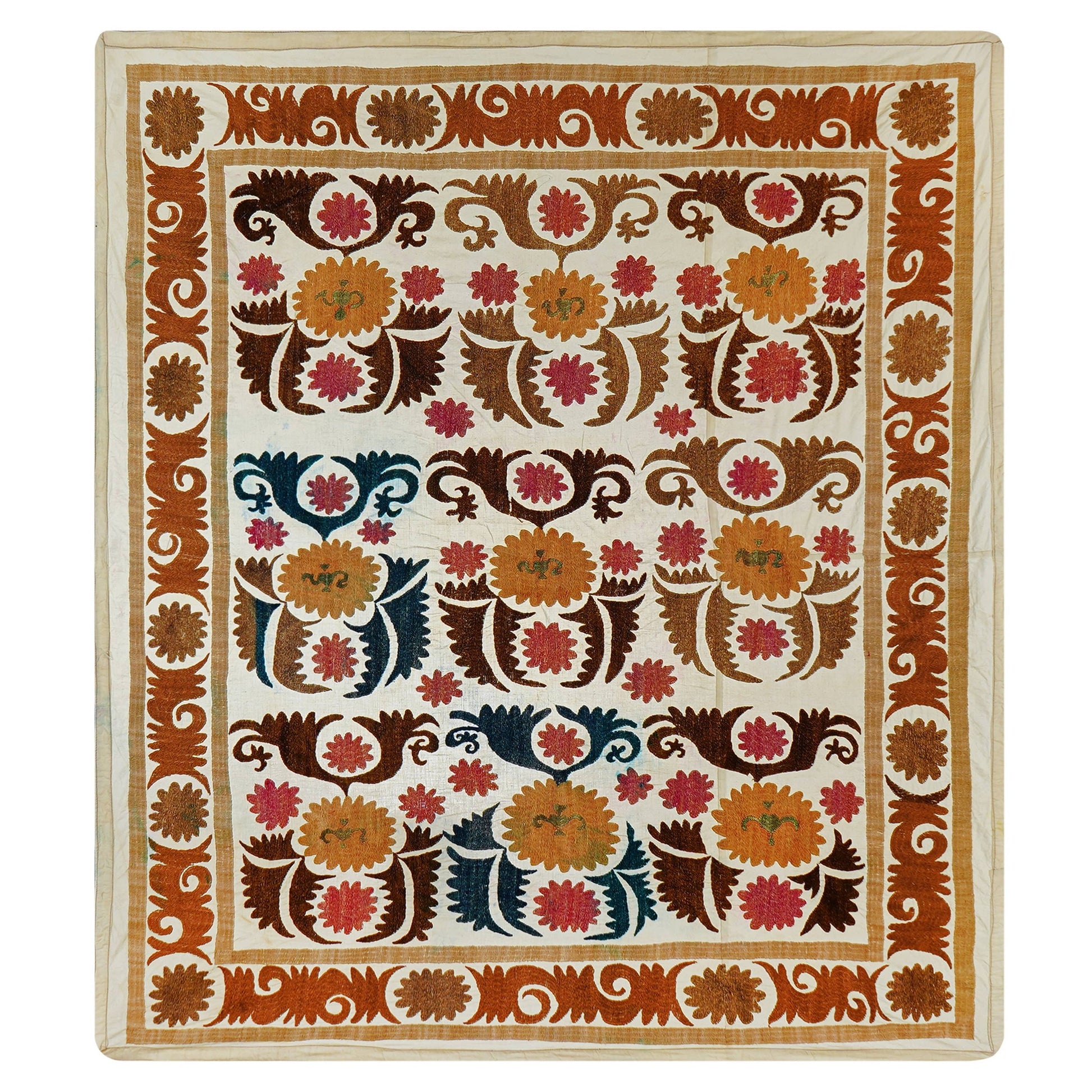 There are variations in the shade of the thread used to embroider this, as is commonly seen in older suzanis that were made for personal use in people’s homes. Embroidery on a cotton base. While this suzani is in wonderful condition, there are small stains and signs of wear on this suzani, that are to be expected with vintage pieces.