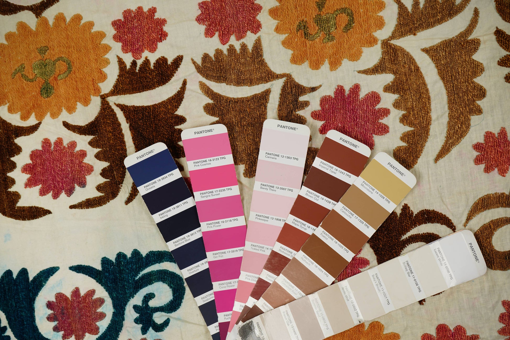 Rich and precious, Suzani fabrics are originally from central Asia. “Suzani” derives from the Anatolian word ""suzan"" for ""needle"" and refers to bright cotton embroidered wall hangings and bedspreads that adorned homes of people on festive occasions.