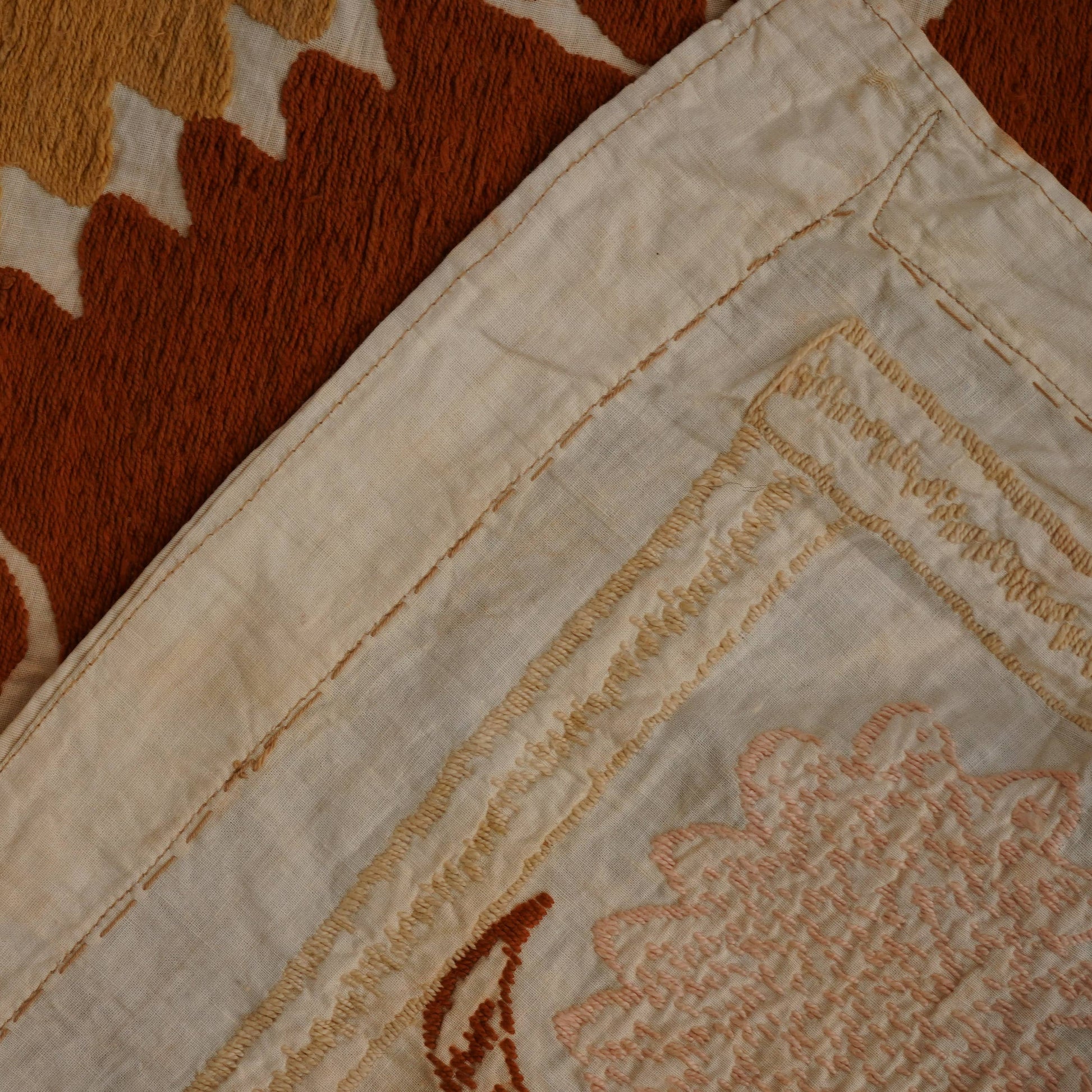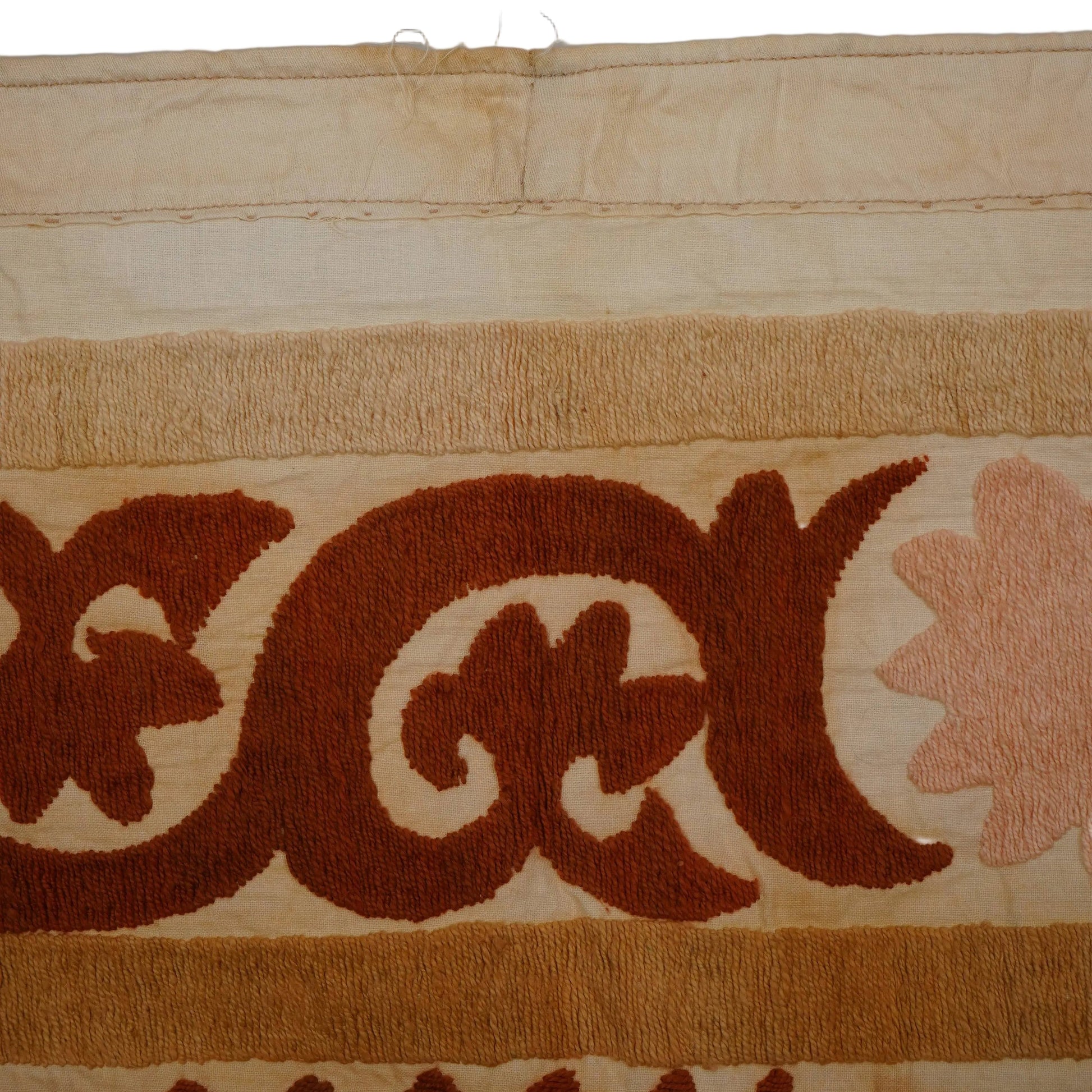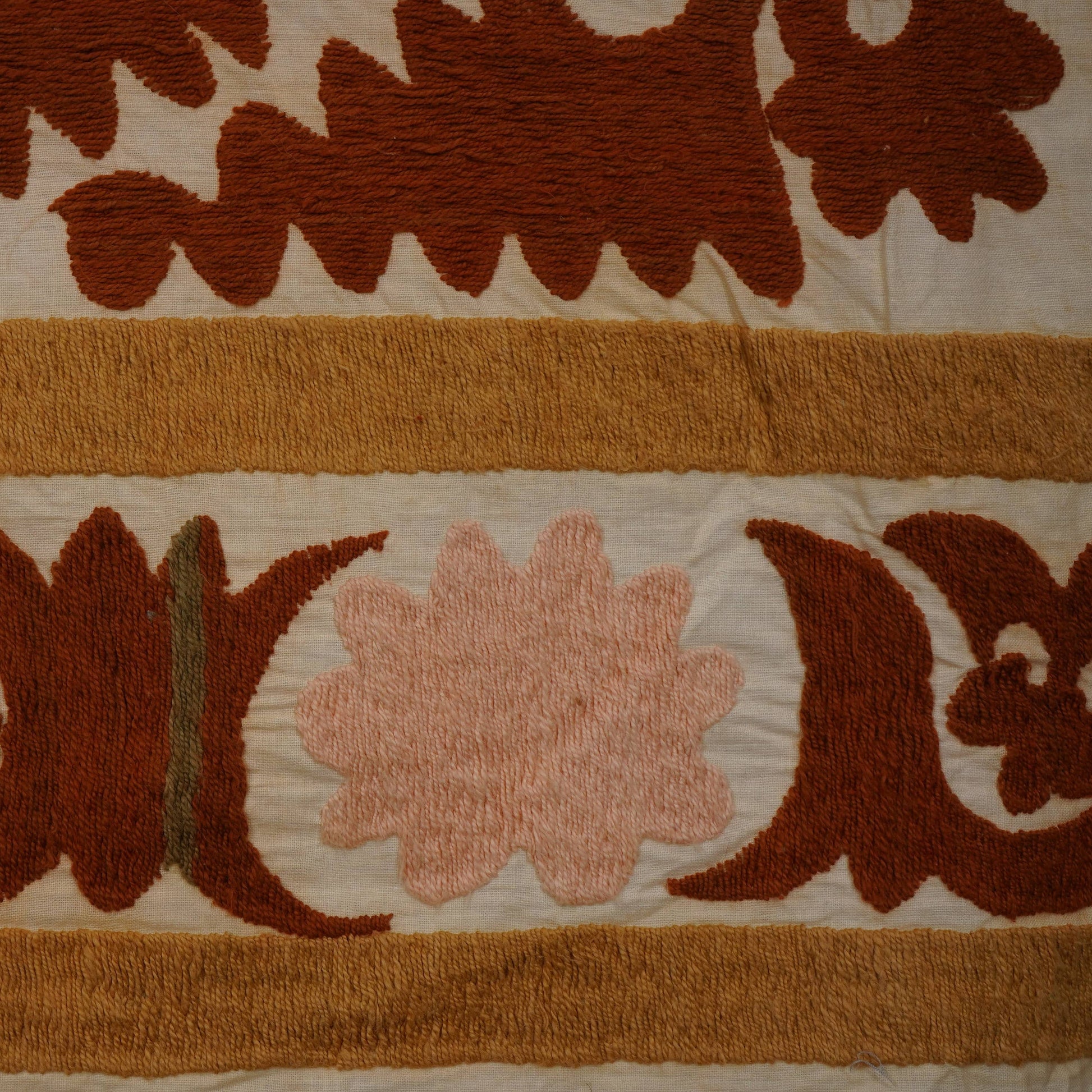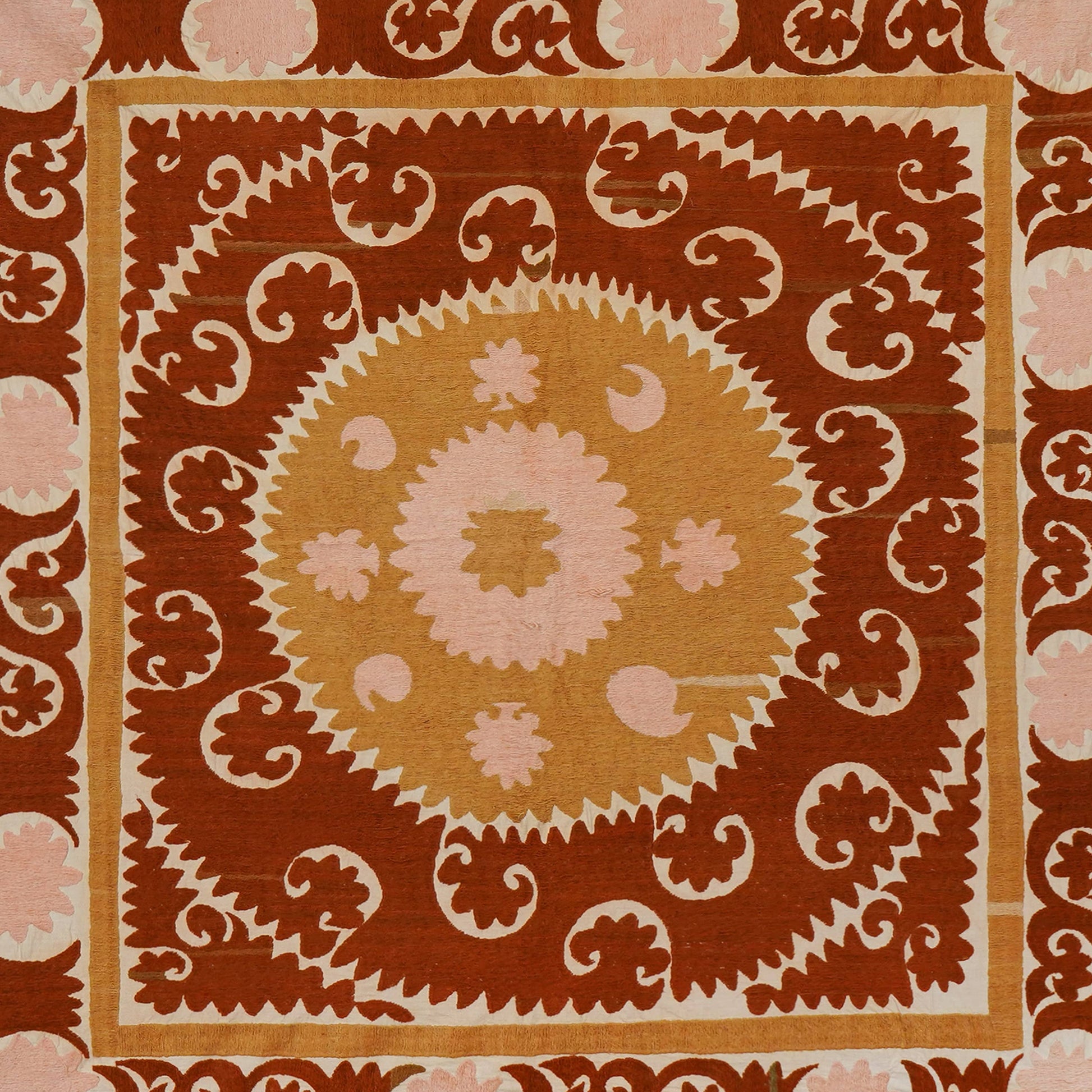 There are variations in the shade of the thread used to embroider this, as is commonly seen in older suzanis that were made for personal use in people’s homes. Embroidery on a cotton base. While this suzani is in wonderful condition, there are small stains and signs of wear on this suzani, that are to be expected with vintage pieces.